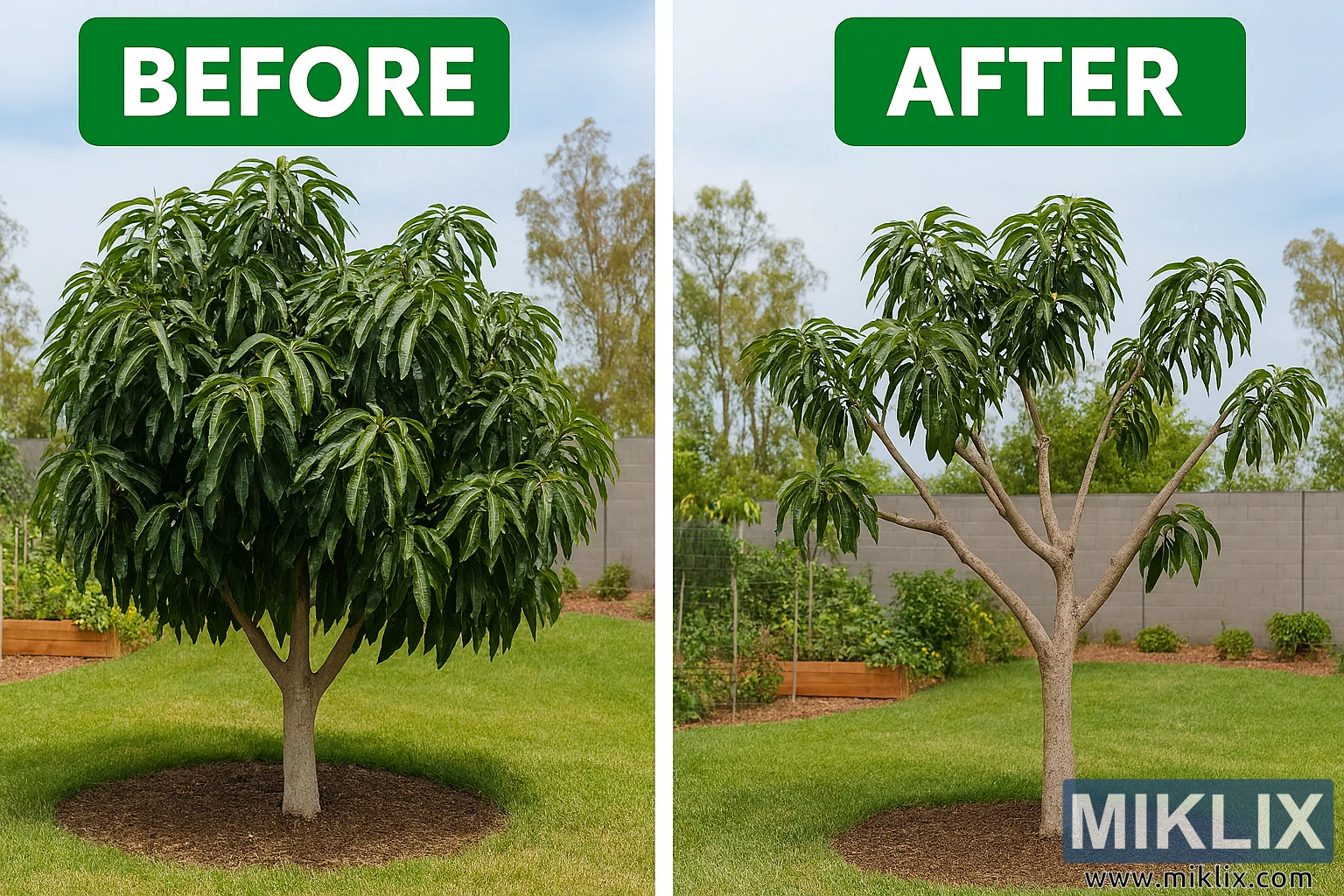 Pogledajte kako pravilno orezivanje transformira stablo manga iz obraslog u zdravo i uravnoteženo. Ova usporedna slika ističe prednosti strukturiranog upravljanja krošnjom.