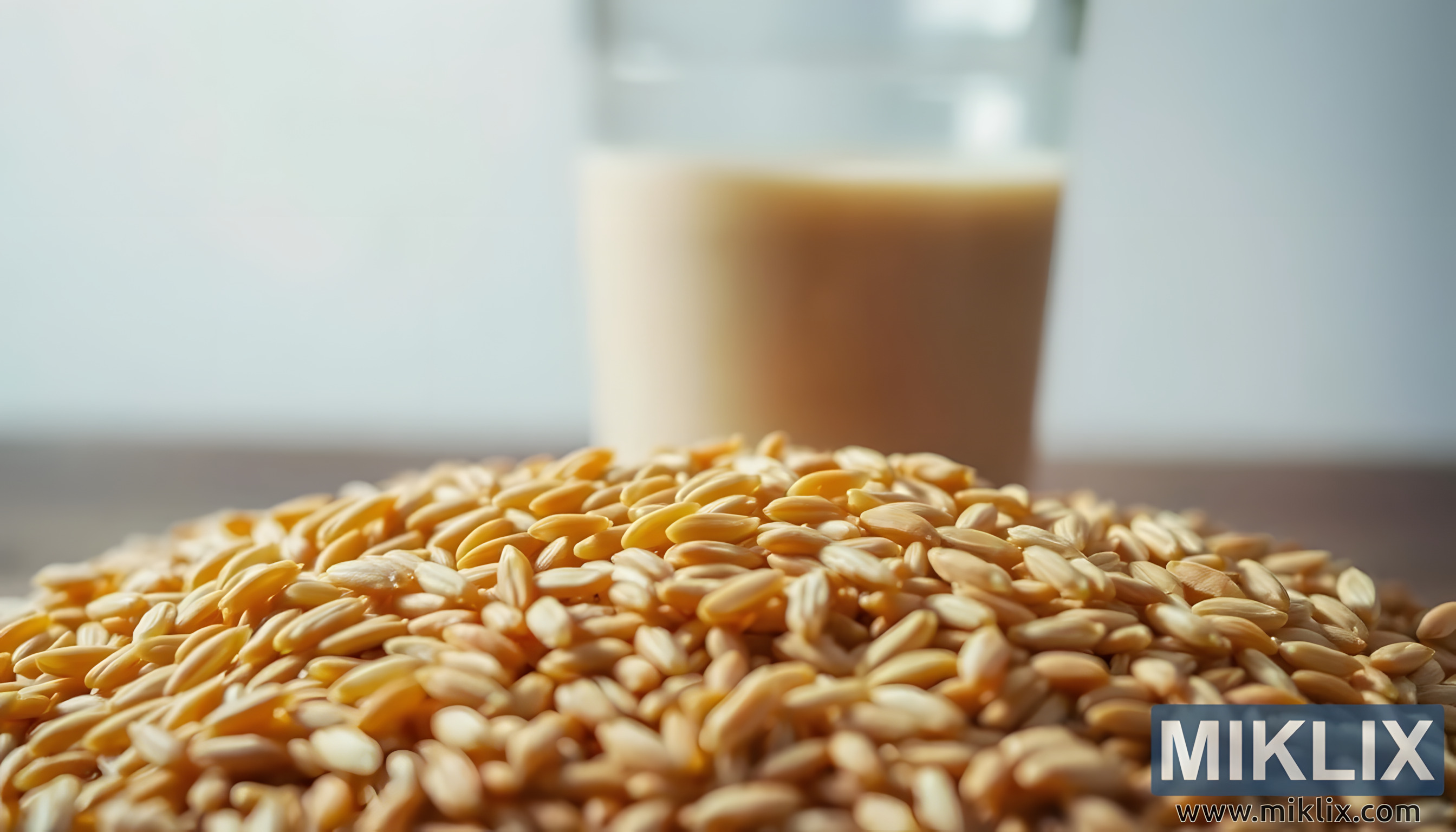 Iz nutritivne perspektive, slika utjelovljuje kvalitete koje smeđu rižu čine temeljem zdrave prehrane širom svijeta. Za razliku od svog poliranog bijelog pandana, smeđa riža zadržava svoje mekinje i klicine slojeve, što joj daje veći sadržaj vlakana, esencijalnih vitamina i korisnih minerala poput magnezija i selena. To je čini ne samo hranjivijom, već i podržava zdravlje probave i održivu energiju. Zemljane boje zrna kao da odražavaju ove kvalitete, vizualno komunicirajući njihovo bogatstvo i dubinu. Nasuprot tome, glatki, kremasti napitak u pozadini predstavlja modernu, inovativnu upotrebu riže, od mlijeka na biljnoj bazi do recepata usmjerenih na zdravlje, pokazujući da se ova drevna žitarica nastavlja prilagođavati i ostati relevantna u savremenim kuhinjama.