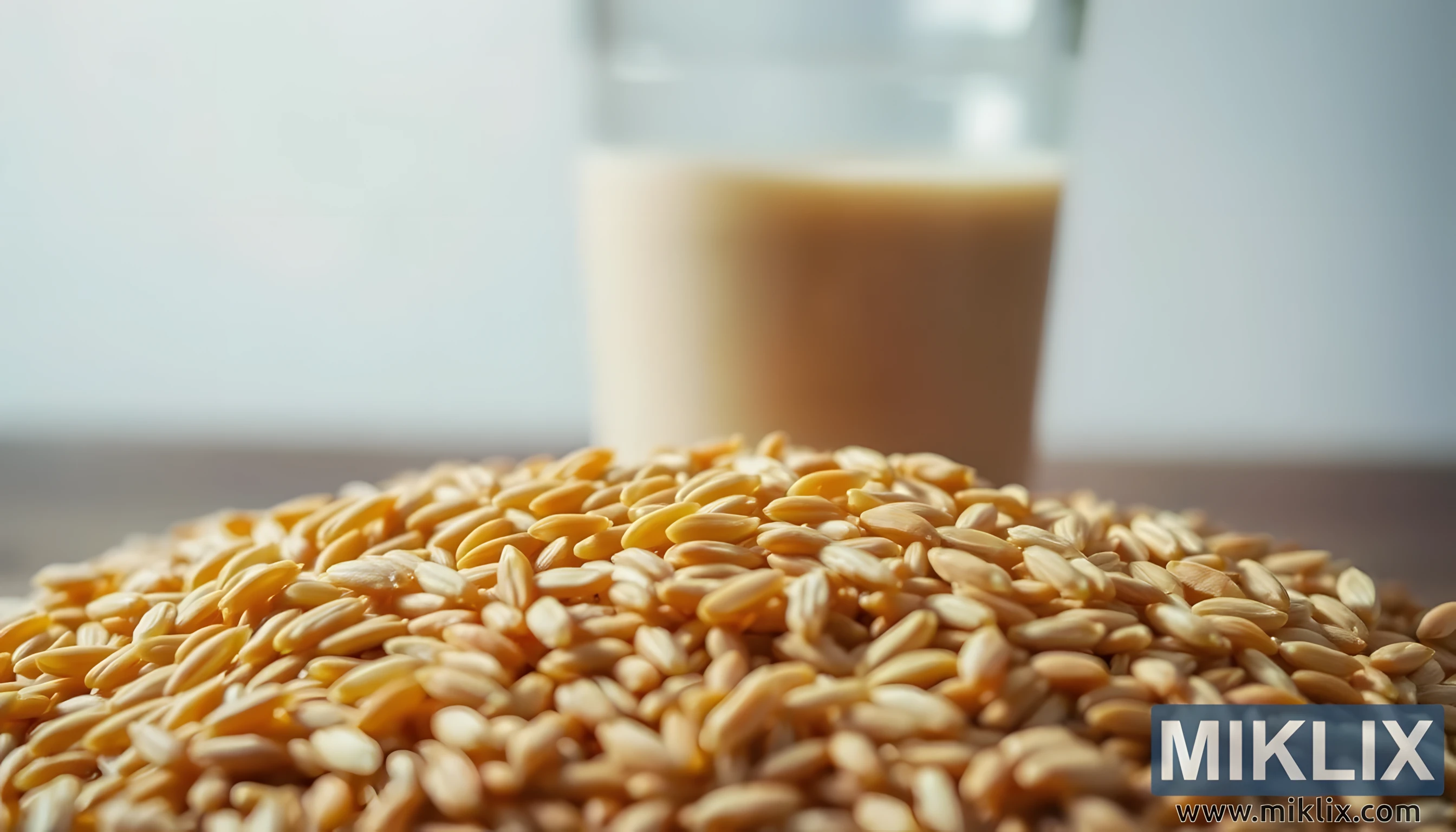Iza gomile riže, u sredini, nalazi se jednostavna, ali svrsishodna čaša napunjena kremastom, bež tekućinom. Njeno prisustvo je suptilno, pomalo zamućeno zbog fokusa kamere na rižu, ali njeno značenje snažno odjekuje. Piće bi se lako moglo protumačiti kao rižino mlijeko ili smoothie bogat hranjivim tvarima, naglašavajući svestrane načine na koje riža može doprinijeti zdravlju i dobrobiti. Njeno pozicioniranje u kadru stvara tihi dijalog između sirovog sastojka u prvom planu i pripremljenog proizvoda u pozadini, ilustrirajući putovanje od zrna do hrane za život. Ovaj spoj potiče na razmišljanje o transformativnim mogućnostima hrane, načinu na koji se jednostavni sastojci mogu uzdići u hranjive obroke i napitke koji održavaju i tijelo i duh.