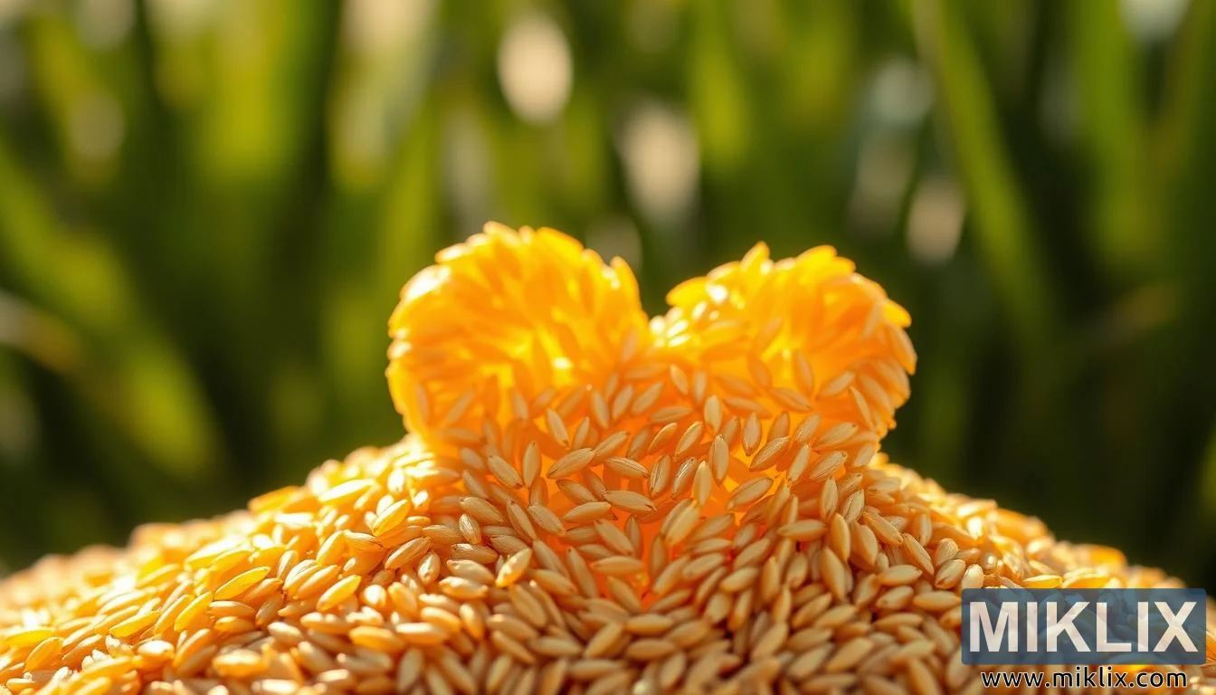 Osvjetljenje na slici igra duboku ulogu u oblikovanju njenog raspoloženja i simbolike. Sunčeva svjetlost djeluje toplo i direktno, gotovo podsjeća na kasno popodne ili ranojutarnji sjaj, kada se svijet osjeća mirno i podmlađujuće. Naglašava zlatne nijanse riže, čineći ih gotovo poput dragulja, i daje obliku srca svetu, gotovo slavljeničku auru. Sjene su meke i suptilne, nikada ne umanjujući svjetlinu, već dodajući nježnu definiciju koja čini da zrna izgledaju taktilno i stvarno. Sveukupni dojam je toplina, briga i spokoj - kvalitete koje odražavaju teme prehrane i blagostanja.
