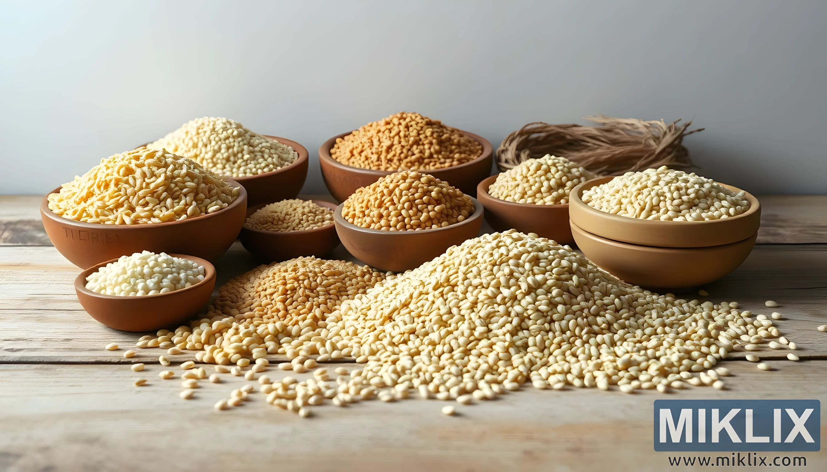 srednjem planu, dodatne zdjele su ispunjene s više vrsta, njihovi oblici se uzdižu u malim vrhovima koji oponašaju blage padine brda. Ovi slojeviti aranžmani stvaraju ritam kroz cijelu kompoziciju, vodeći pogled posmatrača od jedne zdjele do druge i naglašavajući samu raznolikost dostupnih sastojaka bez glutena. Iza njih, mali svežanj suhih stabljika žitarica ležerno počiva, tihi klimanje glavom poljoprivrednim korijenima ove hrane i podsjetnik da potiču s polja koja njeguju tlo, voda i sunčeva svjetlost. Ovo suptilno uključivanje povezuje prikaz s njegovim prirodnim izvorom, dajući slici dublju vezu s ciklusima uzgoja i žetve.