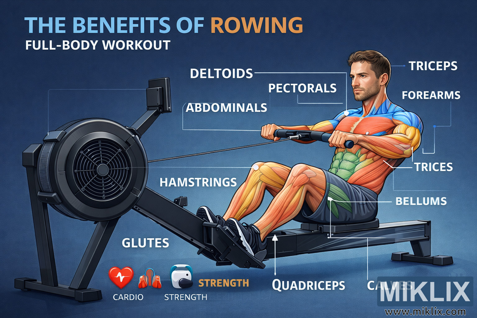 Ova digitalna ilustracija orijentisana na pejzaž predstavlja edukativni pregled prednosti veslanja kao dijela treninga za cijelo tijelo, kombinujući realističnu anatomiju sa jasnim oznakama u stilu infografike. U centru kompozicije je muškarac koji sjedi na veslačkom trenažeru u zatvorenom prostoru, snimljen u snažnoj fazi zamaha. Njegove noge su djelomično ispružene, trup blago nagnut unazad, a ruke povlače ručku prema trbuhu, što ilustruje pravilnu tehniku veslanja. Veslački trenažer je prikazan u čistom, modernom stilu, sa istaknutim kućištem zamašnjaka s lijeve strane i tankim monitorom performansi postavljenim iznad njega.
