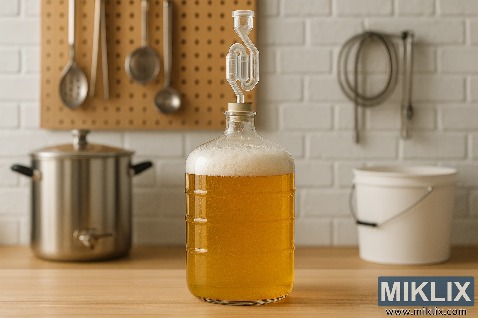 El fons està compost per una paret de maons pintada de blanc, que contribueix a l'estètica neta i lluminosa de l'espai. Penjat contra aquesta paret hi ha un tauler perforat amb diversos estris de cuina d'acer inoxidable, com ara una cullera escumadora gran, un cullerot i unes pinces, tots polits i ordenats. A l'esquerra del garrafó hi ha una gran caldera d'acer inoxidable amb tapa i aixeta a prop de la base, probablement utilitzada per a la fase d'ebullició del most del procés d'elaboració de la cervesa. La seva superfície reflectant reflecteix la llum càlida de l'habitació i ancora visualment l'espai de treball de la cervesa. A la dreta del marc, lleugerament desenfocat, hi ha una galleda de fermentació de plàstic blanc amb una nansa de transport metàl·lica. Enrotllat i penjat a la paret del darrere hi ha un refredador de most d'immersió d'acer inoxidable, que s'utilitza per refredar ràpidament el most bullit abans que comenci la fermentació.