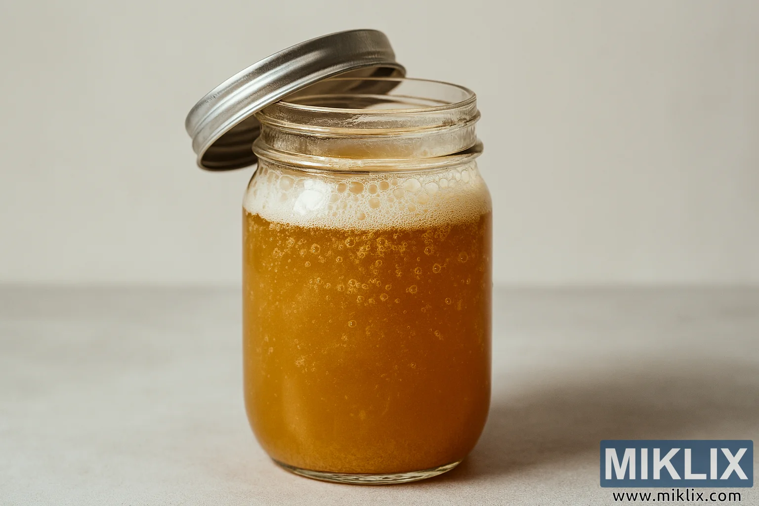 Aquesta imatge captura una vista de primer pla, orientada al paisatge, d'un pot de vidre ple d'un líquid tèrbol, de color daurat-ambre, en fase de fermentació activa: una cervesa agra artesanal en la seva fase de condicionament. El pot està situat centralment sobre un fons net i minimalista, cosa que permet que l'atenció de l'espectador es centri completament en les textures, els colors i la superfície dinàmica del líquid en fermentació.