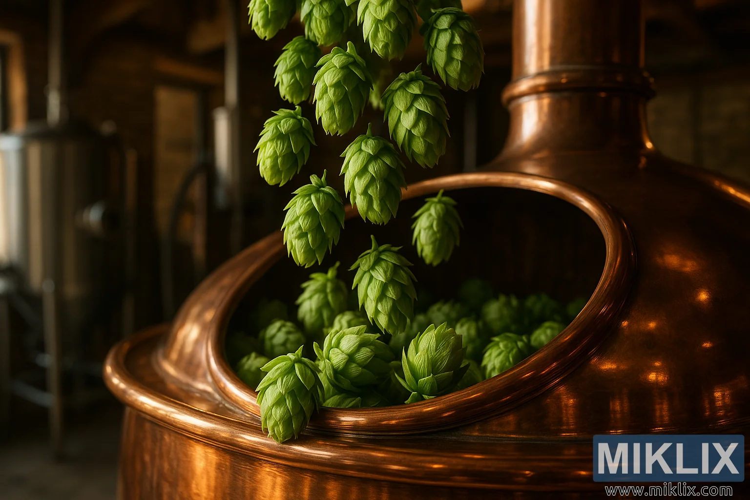 El llúpol Melba acabat de collir cau en una caldera de coure polit, i els seus cons d'un verd viu brillen en l'atmosfera càlida i artesanal d'una cerveseria.