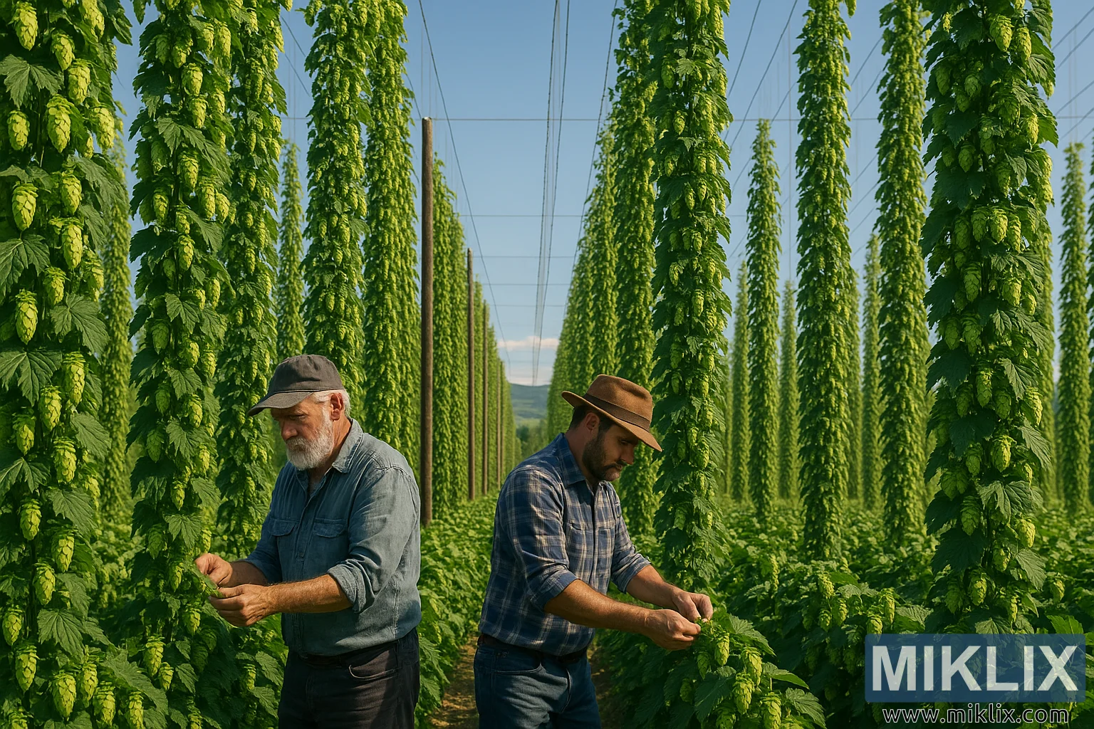 Un verd camp de llúpol Perle amb agricultors cuidant les vinyes sota un cel clar, mostrant la tradició, el patrimoni i el cultiu hàbil d'aquesta varietat històrica.