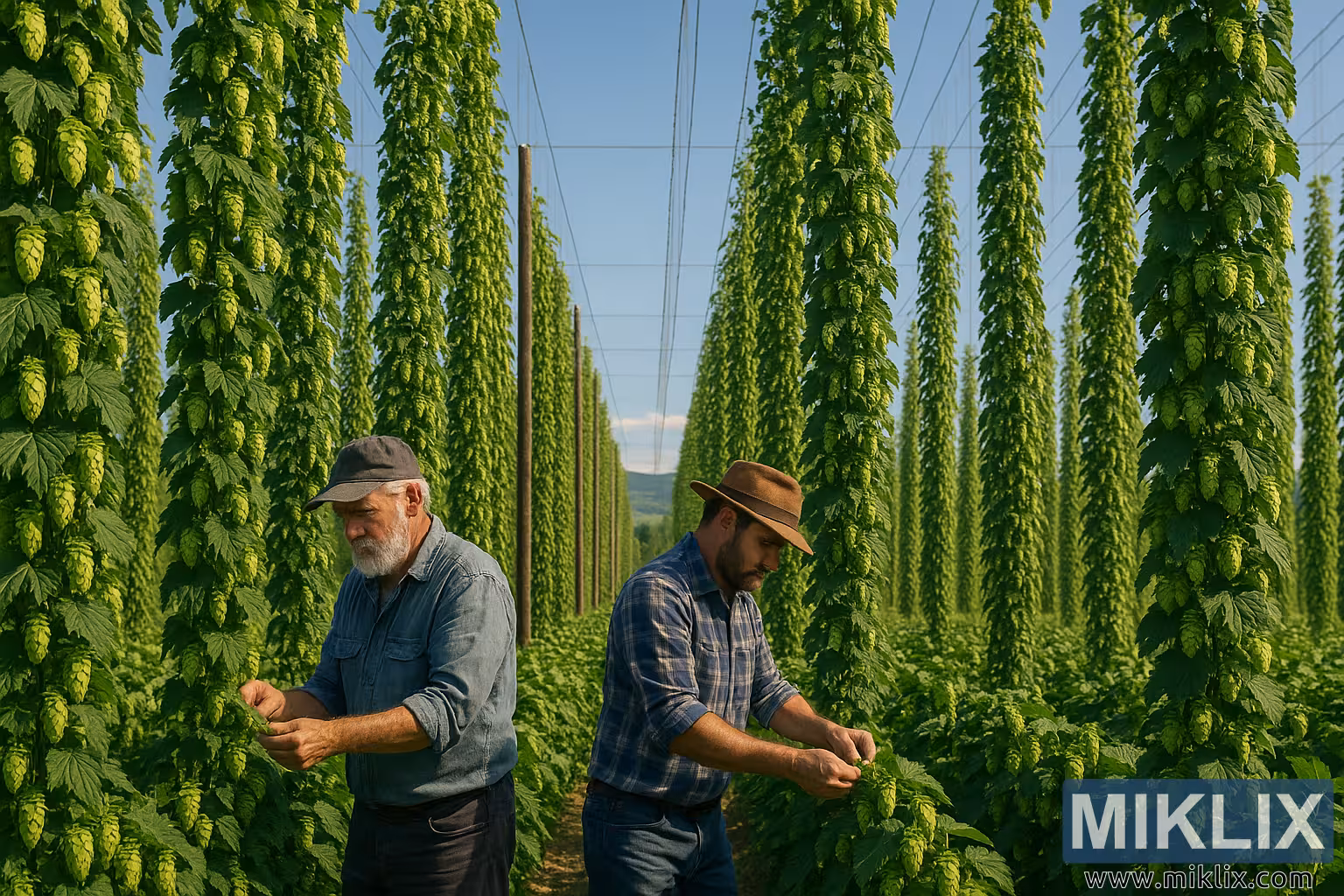 La imatge captura un moment de pràctica agrícola atemporal, on el cultiu del llúpol s'eleva a una forma d'art transmesa de generació en generació. Fileres imponents de vinyes de llúpol Perle s'estenen cap al cel en perfecta alineació, cada vinya carregada de pinyes verdes maragda que brillen suaument a la llum de la tarda. Les plantes, sostingudes per un intricat sistema d'enreixat de pals de fusta alts i línies de filferro tenses, formen una estructura gairebé catedralícia, el seu fullatge dens crea parets verticals de verd que semblen estendre's sense fi cap a l'horitzó. La simetria dels enreixats realça la sensació d'ordre i precisió, subratllant la cura meticulosa que defineix el cultiu del llúpol en la seva màxima expressió.