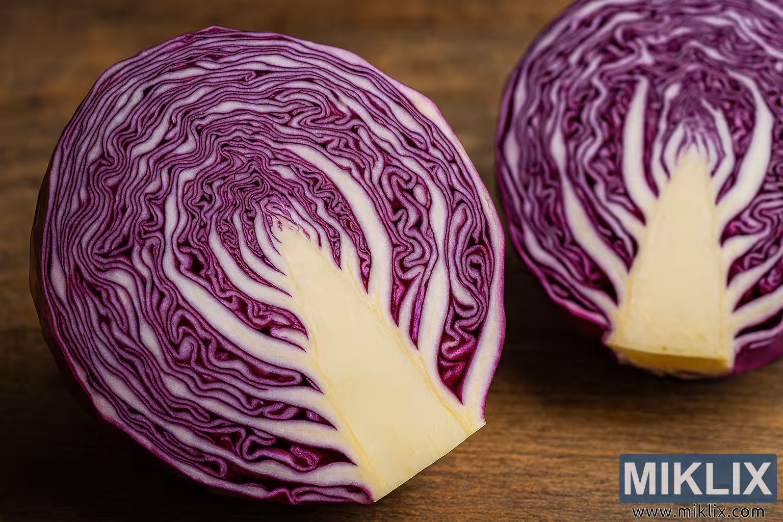 Aquesta fotografia de paisatge d'alta resolució mostra dues meitats d'una col llombarda acabada de collir, tallades netament per revelar la complexa estructura interna de les seves vibrants fulles de color vermell porpra. Les cols estan col·locades sobre una superfície rústica de fusta amb una veta visible i tons marrons càlids, que realcen l'atmosfera orgànica i terrosa de la composició.
