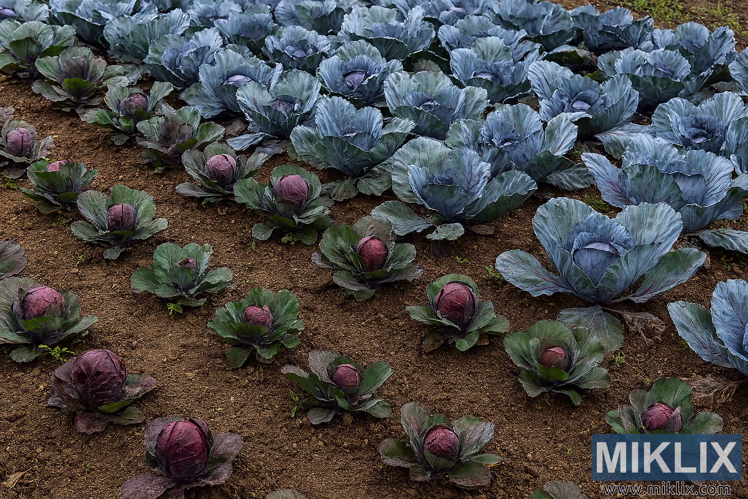 Les fileres continuen cap al fons, disminuint gradualment en mida i detall a causa de la perspectiva. Aquest efecte de profunditat es veu reforçat per la repetició rítmica dels caps de col i les bandes de color alternades creades pels diferents cultivars. El sòl entre les fileres es manté constantment net i ben cuidat, cosa que suggereix una gestió activa del jardí.