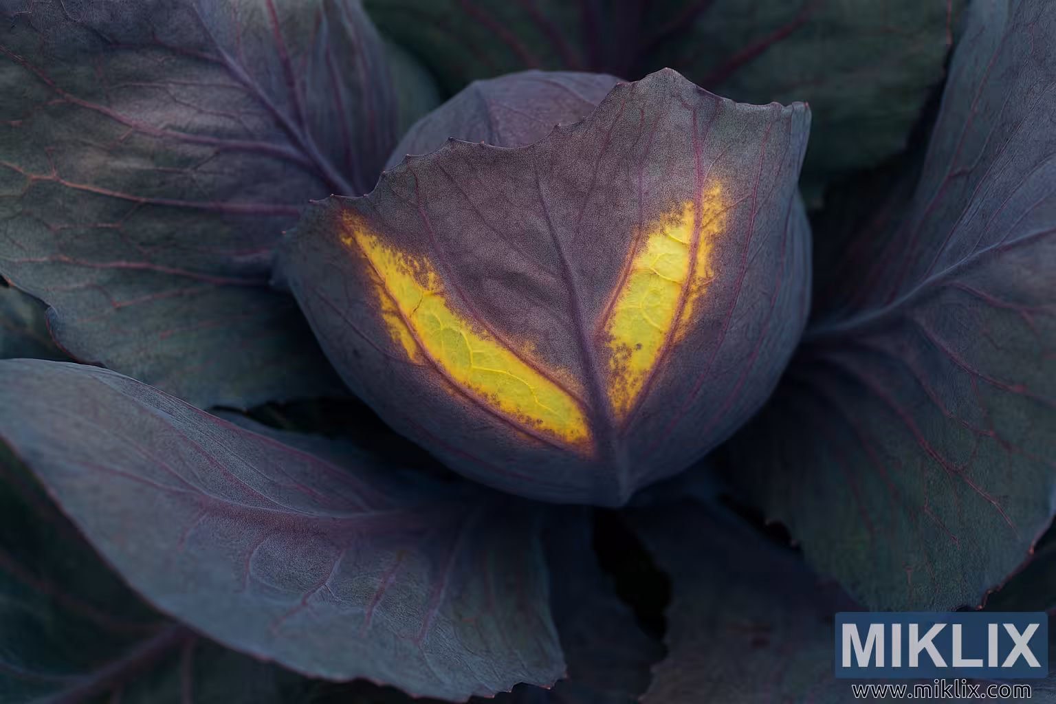 Aquesta imatge de paisatge d'ultra alta resolució presenta una vista de primer pla de fulles de col llombarda que mostren signes primerencs de malaltia foliar. El focus central és una fulla madura amb un to porpra intens, que fa transició a tons verd blavós prop de la base i al llarg de les nervacions. En aquesta fulla destaquen dues lesions grogues en forma de V, cadascuna originada al marge de la fulla i apuntant cap a dins, cap a la nervadura central. Aquestes lesions estan ben definides, amb una vora marró ataronjat lleugerament més fosca que accentua la forma de V i suggereix progressió necròtica. El teixit groc dins de les lesions està clapejat, mostrant gradients subtils des de tons llimona pàl·lids fins a tons daurats saturats, indicatius de clorosi i possible activitat patògena.