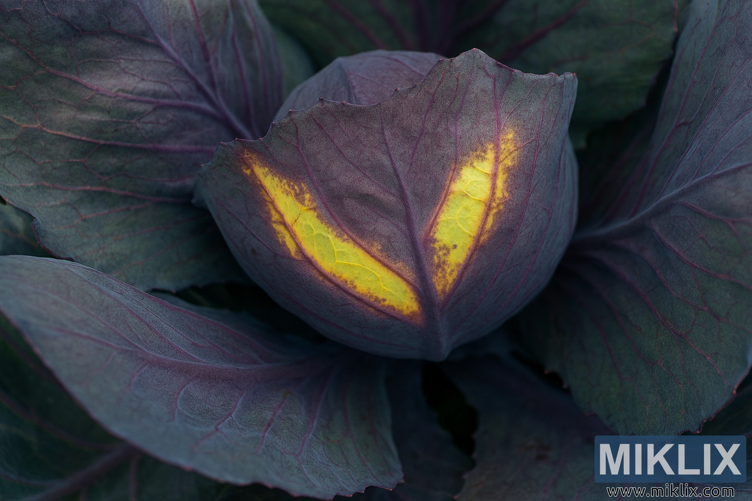 Envoltant la fulla central hi ha diverses altres fulles de col, parcialment visibles i lleugerament desenfocades a causa de la poca profunditat de camp. Aquestes fulles de fons també mostren signes primerencs de malaltia, amb lesions grogues més petites i menys definides i una lleugera decoloració. La seva coloració reflecteix la fulla central, amb tons porpres intensos i verds freds que es barregen amb les ombres.
