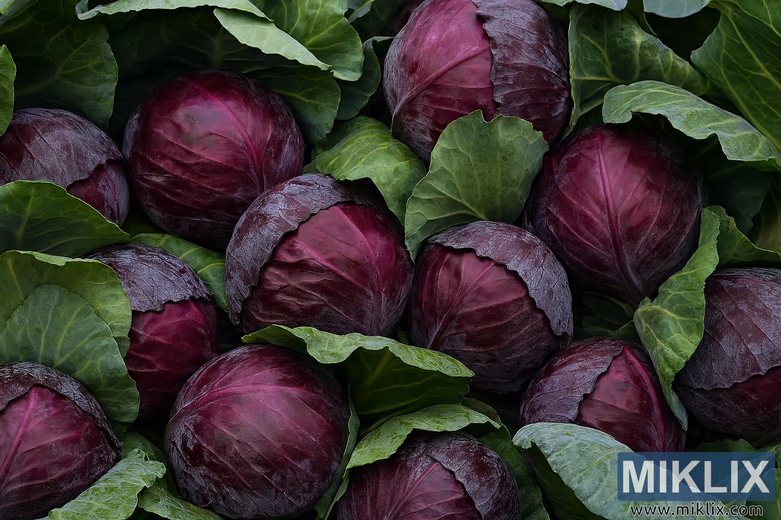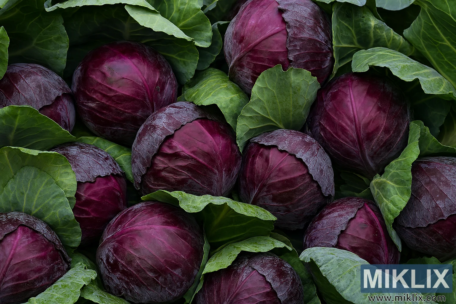 Aquesta imatge de paisatge d'alta resolució captura un arranjament atapeït de caps de col llombarda acabats de collir, cadascun embolicat per les seves fulles exteriors protectores. Les cols estan agrupades en un patró natural i lleugerament caòtic que evoca la immediatesa de la collita i la cura que es té per preservar la seva integritat per a l'emmagatzematge. Cada cap de col mostra un to porpra ric i saturat amb degradats subtils de bordeus i violeta, accentuats per la il·luminació suau i difusa que ressalta les seves superfícies brillants i la curvatura natural. Els caps són ferms i esfèrics, amb fulles superposades que formen una textura en capes, revelant les intricades venes i els contorns arrugats típics de la col llombarda madura.