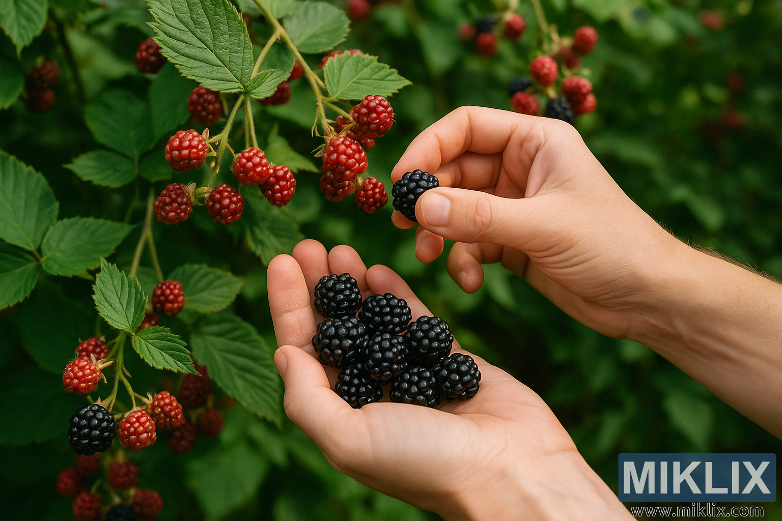 Primer pla de mans collint móres madures de plantes de jardí exuberants, envoltades de fulles verdes i llum solar, simbolitzant la collita de fruita d'estiu i els productes casolans.