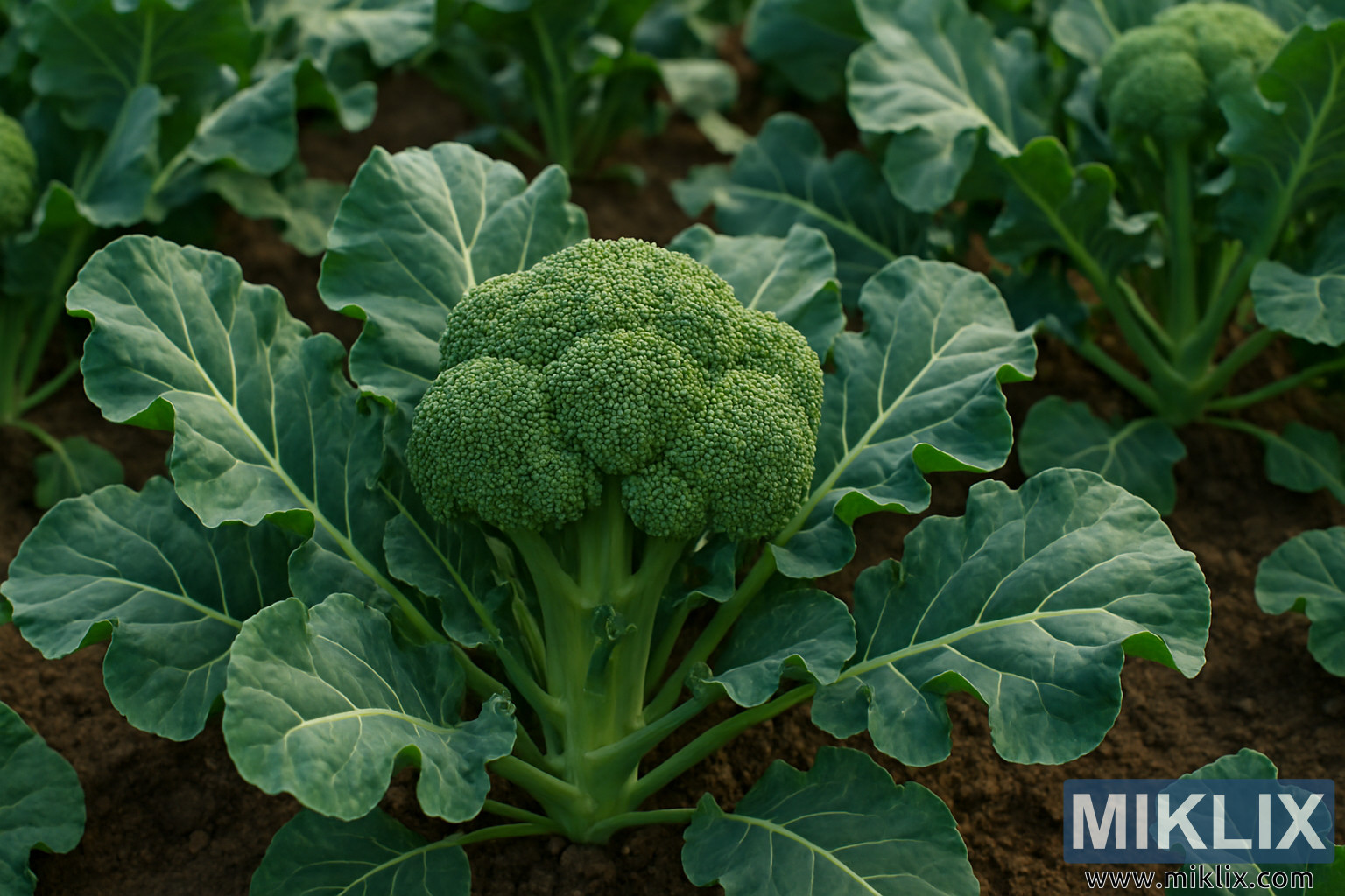 Un exuberant jardí de bròquil amb densos caps verds i fulles amb nervadura ampla que creixen en un sòl fosc, ressaltat per la llum natural per a un aspecte vibrant.