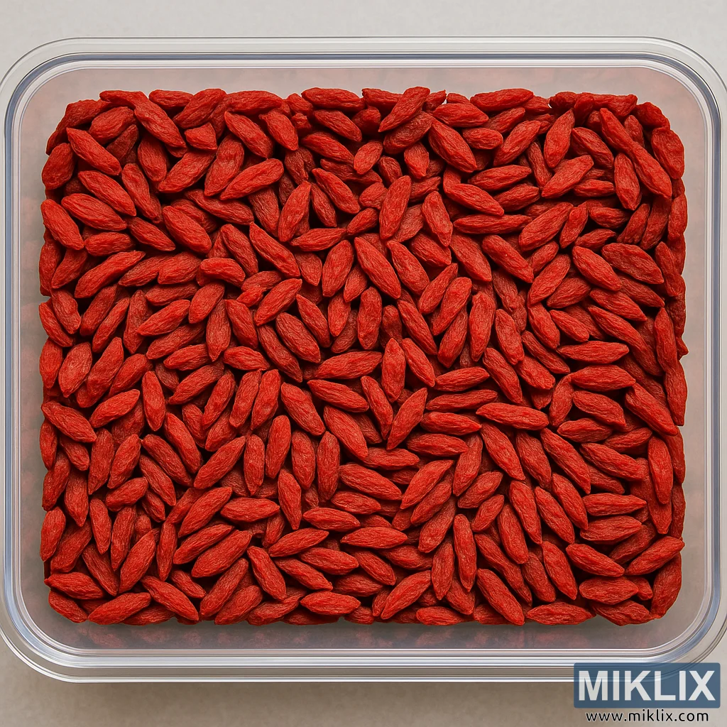 Aquesta fotografia d'alta resolució captura una col·lecció ordenada de baies de goji seques dins d'un recipient d'emmagatzematge de plàstic rectangular transparent. El recipient es veu des d'una perspectiva de dalt a baix, orientada al paisatge, oferint una vista completa de les baies densament compactades que omplen tot el marc. Cada baia de goji presenta la seva característica forma allargada i ovalada amb una pell lleugerament arrugada i coriàcia. La paleta de colors està dominada per tons vermells vibrants i naturals, que van des del carmesí intens fins a tons de maó lleugerament apagats, reflectint la variació orgànica típica de les baies seques. Les superfícies texturitzades de les baies mostren crestes i plecs subtils, evidència del procés d'assecat que preserva els seus nutrients i sabor concentrats. La il·luminació de la imatge és suau i distribuïda uniformement, eliminant les ombres dures i emfatitzant els contorns naturals i la profunditat del color de les baies. Les parets clares i les cantonades arrodonides del recipient afegeixen un element net i minimalista a la composició, proporcionant una sensació d'ordre i simplicitat moderna. El fons sota el recipient és neutre, probablement una superfície mat de color clar com el beix o el gris pàl·lid, garantint que el focus es mantingui únicament en el contingut vermell vibrant. L'enquadrament ajustat i la manca d'elements addicionals a l'escena donen a la imatge una precisió documental, adequada per a contextos culinaris, nutricionals o d'envasament. Aquesta presentació visual evoca frescor i qualitat, típiques de les fruites seques ben conservades a punt per al consum o l'exposició. La impressió general és de claredat, abundància i atractiu natural, amb cada detall visual, des de les fines arrugues de cada baia fins a la vora transparent de la caixa d'emmagatzematge, representat amb detalls nítids i realistes. La imatge podria servir fàcilment en contextos relacionats amb l'alimentació saludable, l'emmagatzematge d'aliments, els superaliments o els catàlegs d'ingredients, oferint una estètica neta i professional que destaca tant la simplicitat com la riquesa del tema. L'alta resolució permet als espectadors apreciar les qualitats tàctils de les baies de goji, convidant a una inspecció més detallada i reforçant la seva associació amb la salut i la vitalitat naturals.