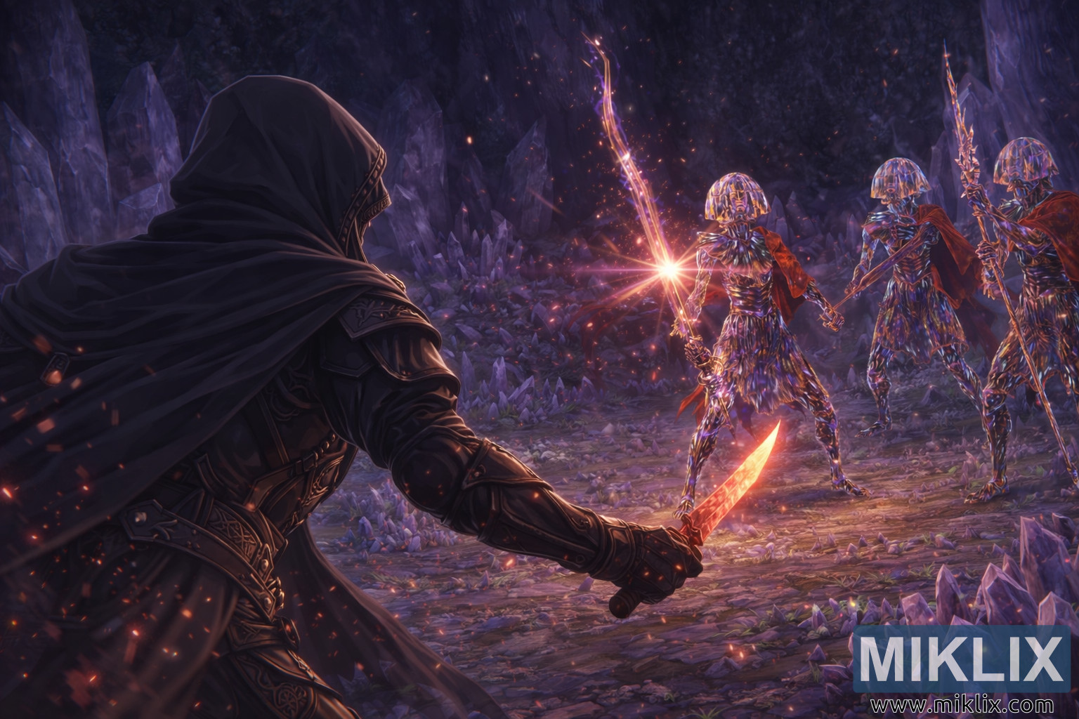 L'altra banda del terra de la caverna hi ha el Trio Cristal·lià Pútrid, amb els cossos formats per un cristall semitransparent que refracta la llum ambiental en blaus, porpres i blancs freds brillants. El Cristal·lià central domina la composició, projectant cap endavant una llarga llança imbuïda d'energia violeta crepitant. A la punta de la llança, una brillant explosió estel·lar de llum arcana s'escampa cap a l'exterior, marcant el moment precís abans de la col·lisió. A la dreta, un altre Cristal·lià aixeca una pesada espasa cristal·lina, amb la fulla dentada com vidre trencat, a punt de balancejar-se en un arc letal. Més enrere, el tercer Cristal·lià agafa un bastó tort que pulsa amb màgia corrupta, la seva resplendor misteriosa insinuant la podridura pútrida que infecta aquestes formes cristal·lines, d'altra banda prístines. Els seus cascos facetats semblen pedres precioses polides, sota les quals es poden veure cares humanoides tènues, inexpressives i alienígenes.