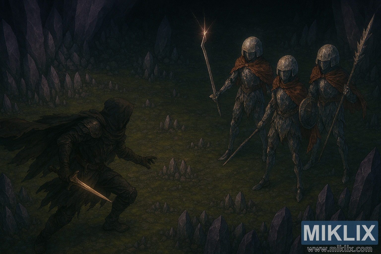 La caverna en si mateixa és un espectacle impressionant de formacions cristal·lines esmolades que emergeixen del terra i de les parets. Aquestes formacions brillen amb suaus tons porpres i blaus, projectant llum etèria a través del terra cobert de molsa i reflectint-se en l'armadura i les armes dels combatents. Fragments de cristall més petits s'escampen pel terreny, afegint textura i profunditat. El fons s'esvaeix en l'ombra, suggerint l'immensa escala i el misteri de la caverna.