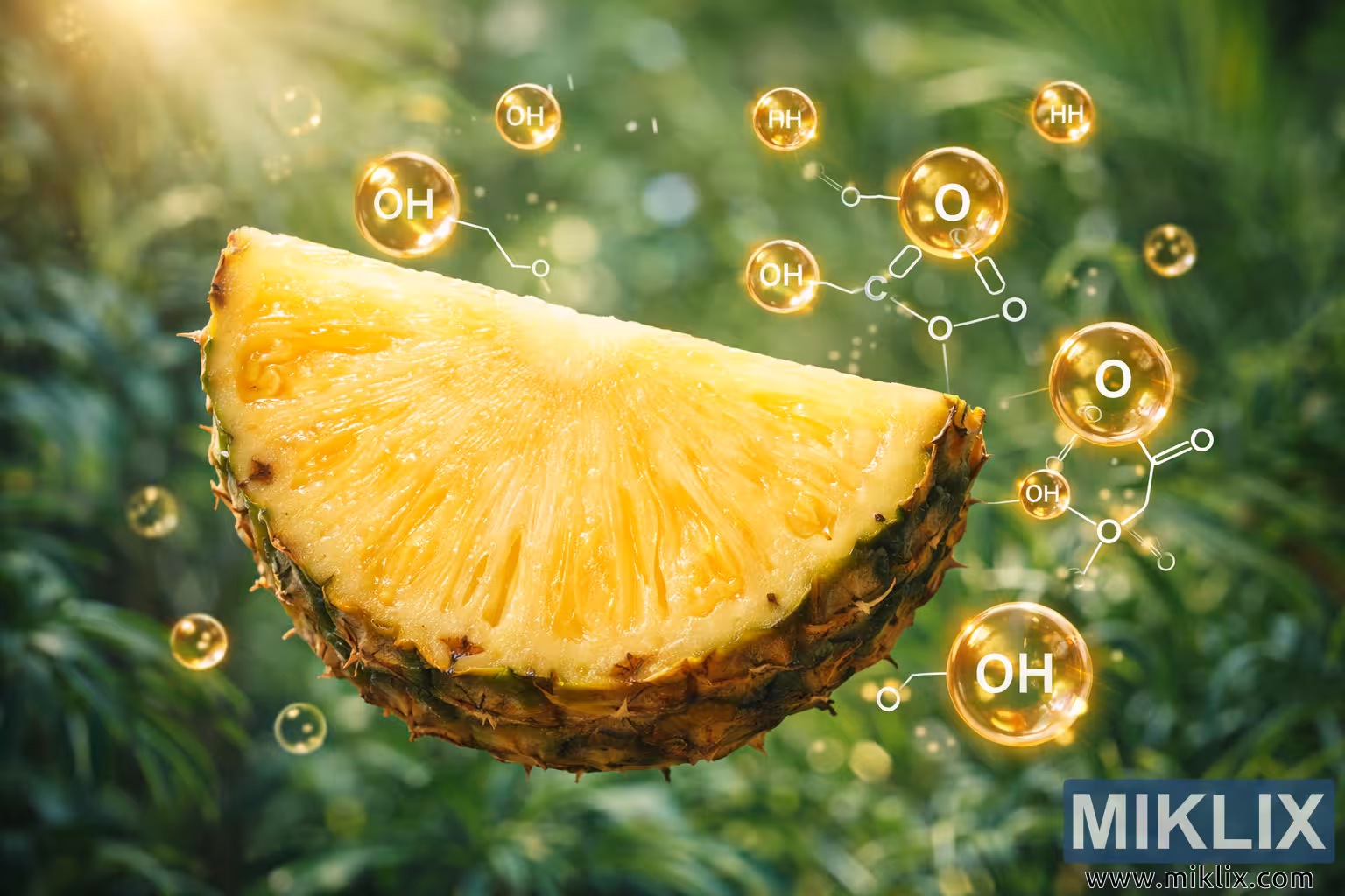 Al voltant de la pinya hi ha esferes translúcides i brillants que representen molècules antioxidants. Aquestes esferes semblen ingràvides, flotant suaument per l'aire al voltant de la fruita. Cada esfera es representa en un to ambre o daurat lluminós, captant els reflexos com si estiguessin fetes de vidre o llum líquida. Algunes de les bombolles estan inscrites amb símbols químics simplificats com ara "O" i "OH", mentre que d'altres estan connectades per primes línies moleculars blanques que tracen estructures químiques abstractes, suggerint subtilment la vitamina C i altres compostos antioxidants comunament associats amb la pinya. Els gràfics moleculars són nets i minimalistes, i s'integren perfectament amb l'escena fotogràfica de manera que el concepte científic se sent integrat en lloc de superposat.
