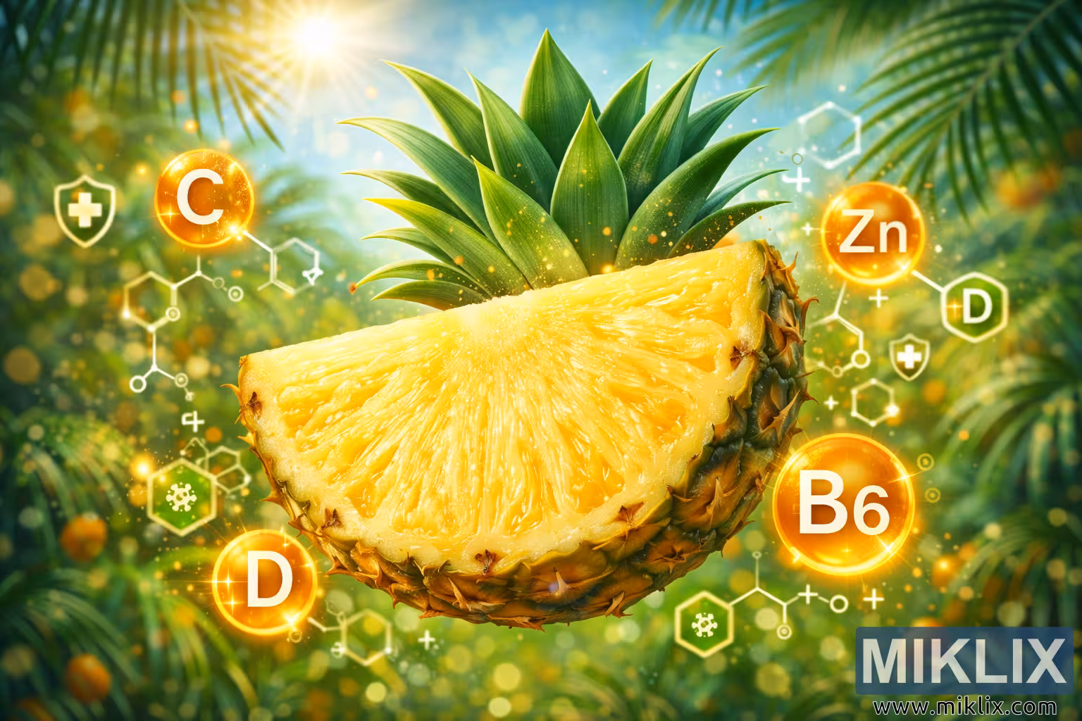 Al voltant de la pinya hi ha icones circulars brillants que representen nutrients que enforteixen el sistema immunitari. Cada orbe emet una càlida llum daurada i està etiquetat amb un text simplificat com ara "C" per a la vitamina C, "Zn" per al zinc, "B6" per a la vitamina B6 i "D" per a la vitamina D. Aquests símbols de nutrients s'intercalen amb subtils formes d'escut, signes positius i diagrames moleculars estilitzats, que reforcen visualment la idea de protecció, salut i activitat biològica. Les icones semblen flotar suaument al voltant de la fruita, com si estiguessin suspeses en una brisa tropical, creant una composició dinàmica i energètica.