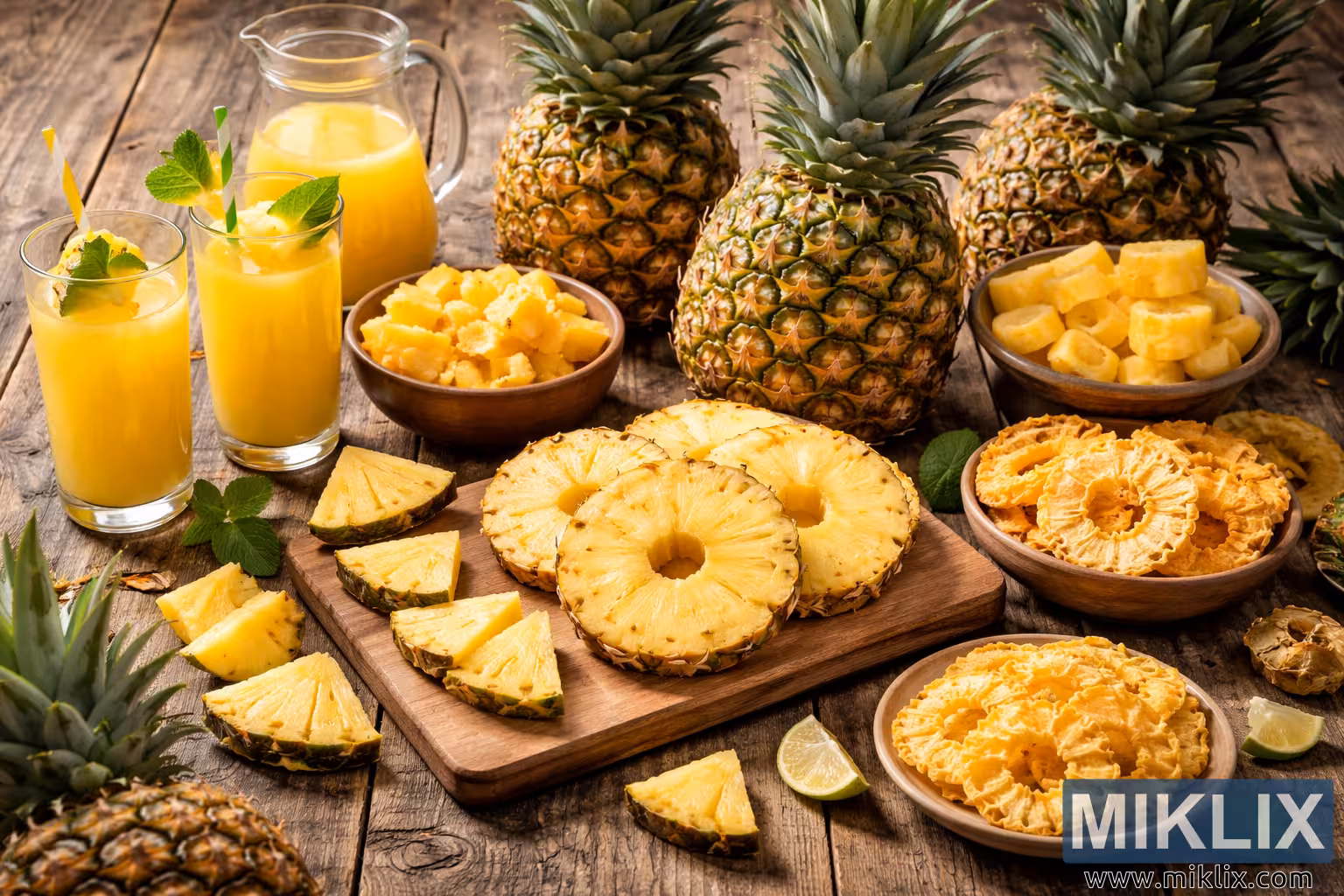 Natura morta de paisatge amb pinyes senceres, fruita tallada a rodanxes, anelles de pinya seca i suc de pinya fresc sobre una taula de fusta rústica amb detalls de menta i llima.