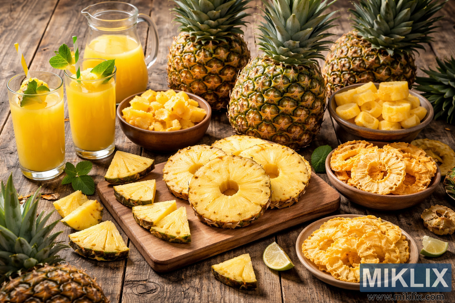 Una fotografia de paisatge d'alta resolució i càlidament il·luminada presenta una rica natura morta de pinyes i productes de pinya disposats sobre una taula de fusta rústica i desgastada. El fons està format per taulons amples i texturitzats, les esquerdes i els patrons de veta dels quals afegeixen un ambient artesanal i de granja. Al centre de la composició hi ha una taula de tallar rectangular de fusta amb tres anelles de pinya perfectament tallades, sense el nucli circular i amb la polpa sucosa i fibrosa que brilla en tons groc daurat. Al voltant de la taula hi ha falques de pinya triangulars amb pells verdes i daurades, algunes col·locades casualment sobre la taula i altres recolzades contra la taula per crear profunditat i ritme visual.