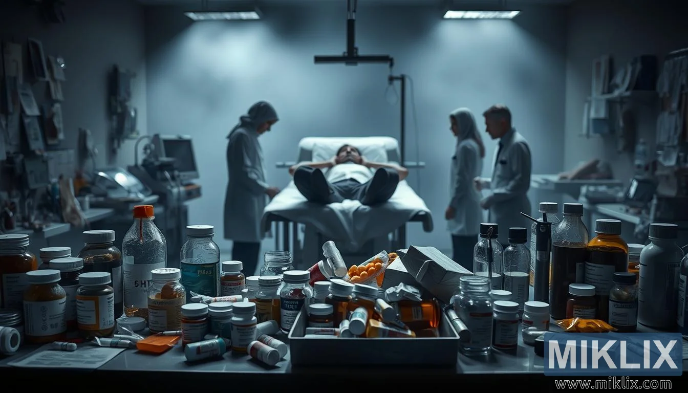 L'escena es desenvolupa dins dels confins d'unes instal·lacions mèdiques estèriles i amb poca llum, on un contrast inquietant entre l'ordre clínic i el desordre caòtic domina la composició. En primer pla immediat, un escriptori està ple d'envasos farmacèutics, pots de pastilles, blísters, xeringues i diversos instruments mèdics. Les etiquetes, tot i que parcialment ocultes, suggereixen un ampli espectre de substàncies, algunes recognoscibles, altres ambigües, cadascuna amb el pes tant d'una possible curació com d'un possible dany. Esparses entre elles hi ha ampolles marcades amb instruccions de dosificació i text de precaució, que evoquen la realitat aleccionadora de la gestió complexa de medicaments. El gran volum d'envasos i la disposició desordenada creen una sensació de desordre, amplificant el malestar que subjau a tota l'atmosfera.