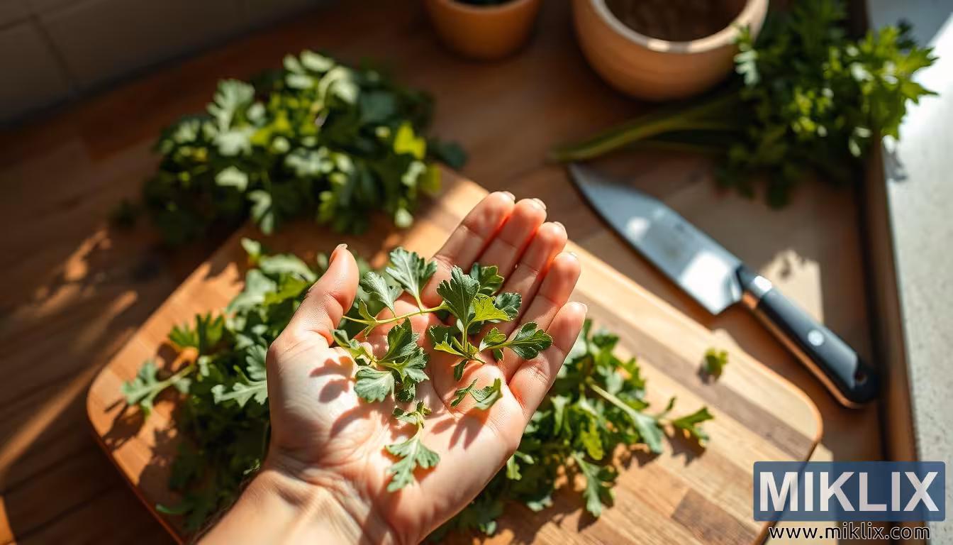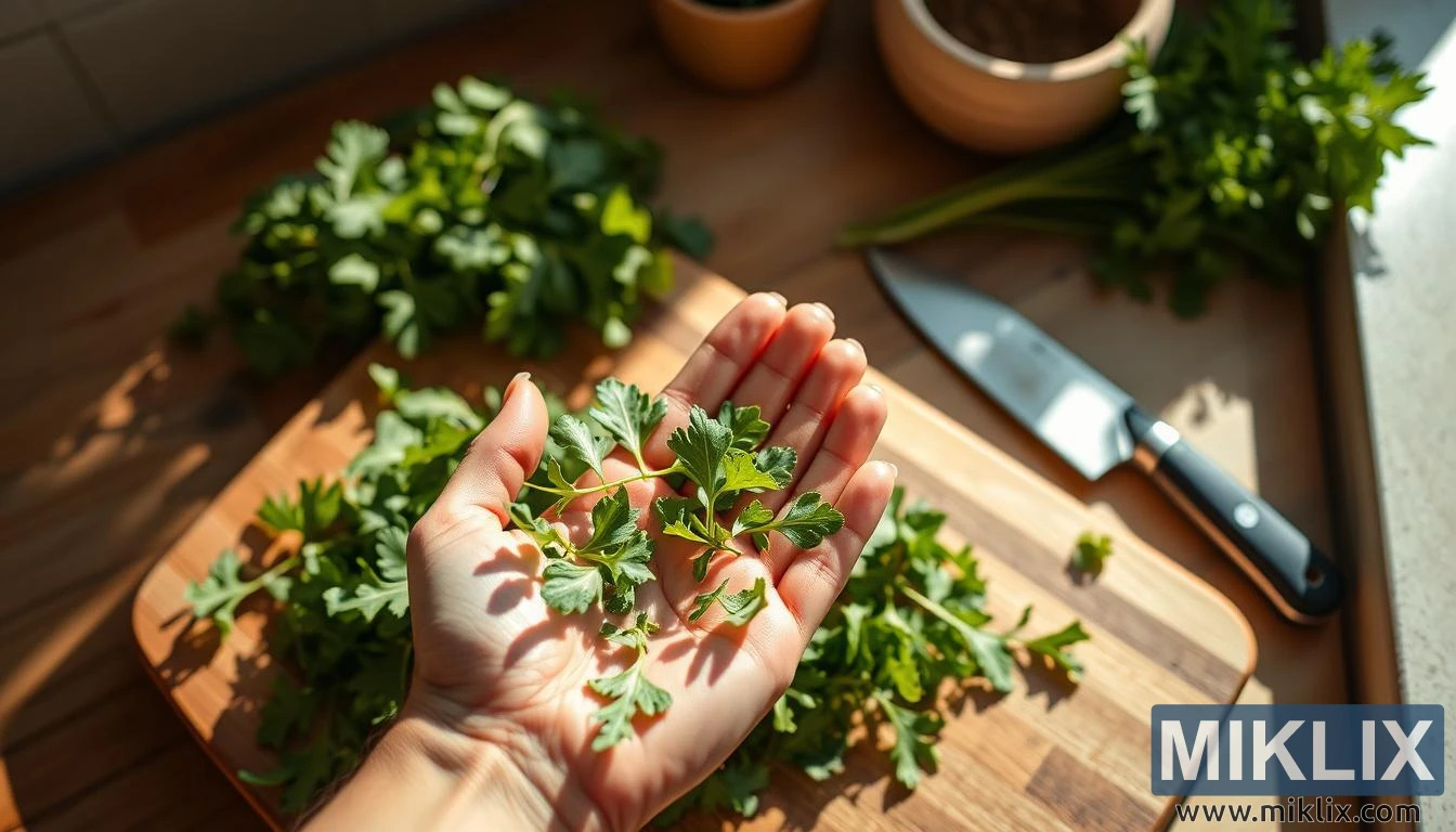 La imatge captura un moment de tranquil·la simplicitat i bellesa al cor d'una cuina, on els ingredients frescos prenen protagonisme i l'acte de preparació esdevé alhora un art i un ritual. L'escena està il·luminada per una suau llum del sol daurada que entra des d'una finestra propera, omplint l'espai de calidesa i destacant cada detall subtil. Al davant, una mà acaroneix suaument un petit grup de fulles fresques de ruca, les seves vores delicades i serrades i els seus rics tons verds destaquen contra els matisos càlids de la pell i la fusta. La mà, oberta i relaxada, suggereix reverència per l'ingredient, com si reconegués el viatge d'aquestes fulles de la terra a la cuina. El seu color vibrant i la seva textura cruixent evoquen vitalitat i frescor, un recordatori de les qualitats nutritives inherents als aliments naturals i sense processar.