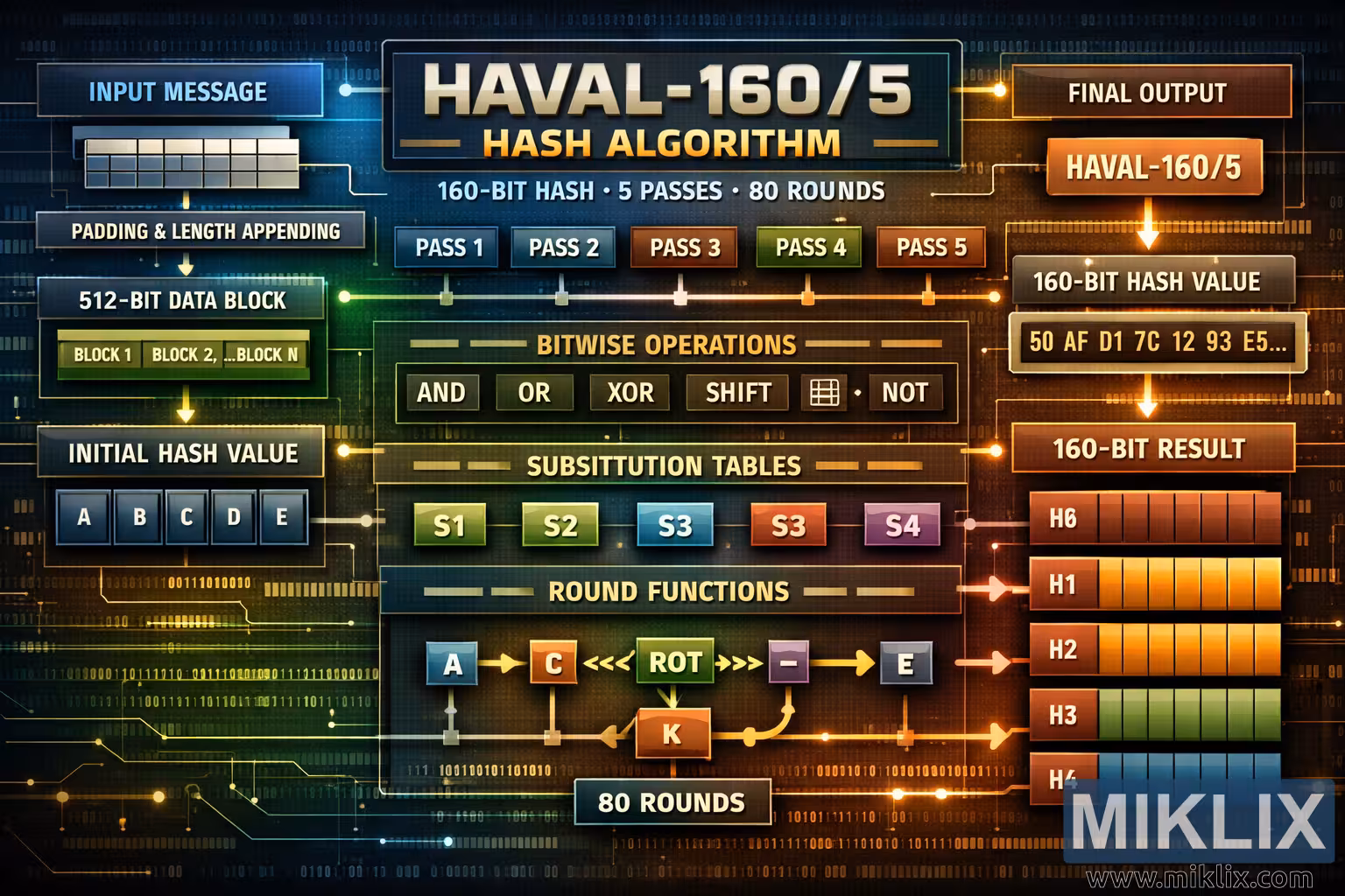 Detailed visual overview of the HAVAL-160/5 cryptographic hash function, illustrating message preprocessing, five transformation passes, round functions, and the final 160-bit digest.