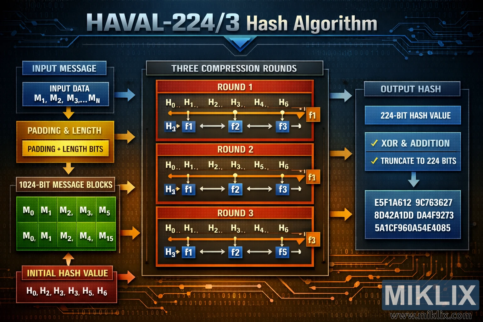High-level visualization of the HAVAL-224/3 hash algorithm, depicting input preprocessing, 1024-bit blocks, initialization, three compression rounds, and generation of a 224-bit digest.