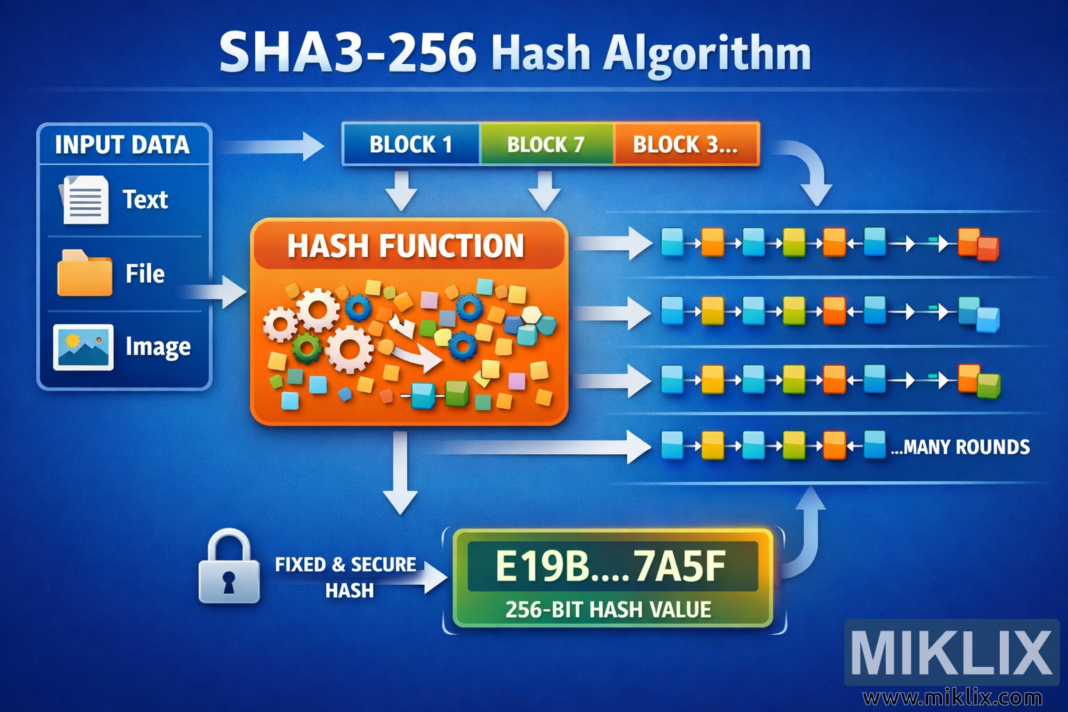 A clear, easy-to-understand infographic visualizing the SHA3-256 hash algorithm, showing how input data is transformed into a fixed-length digest.
