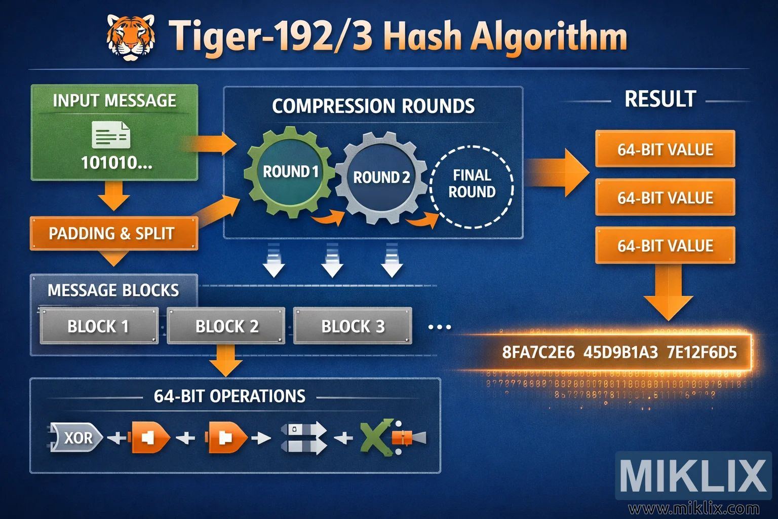 Educational infographic explaining the structure of the Tiger-192/3 hash algorithm, illustrating input processing, compression rounds, and the final 192-bit output.