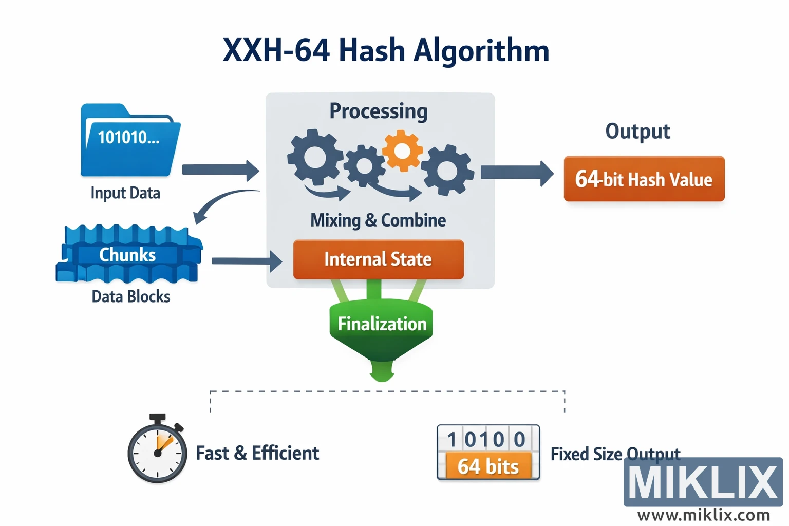 An easy-to-understand infographic that visualizes the high-level flow of the XXH-64 hashing algorithm from input data to fixed-size 64-bit output.