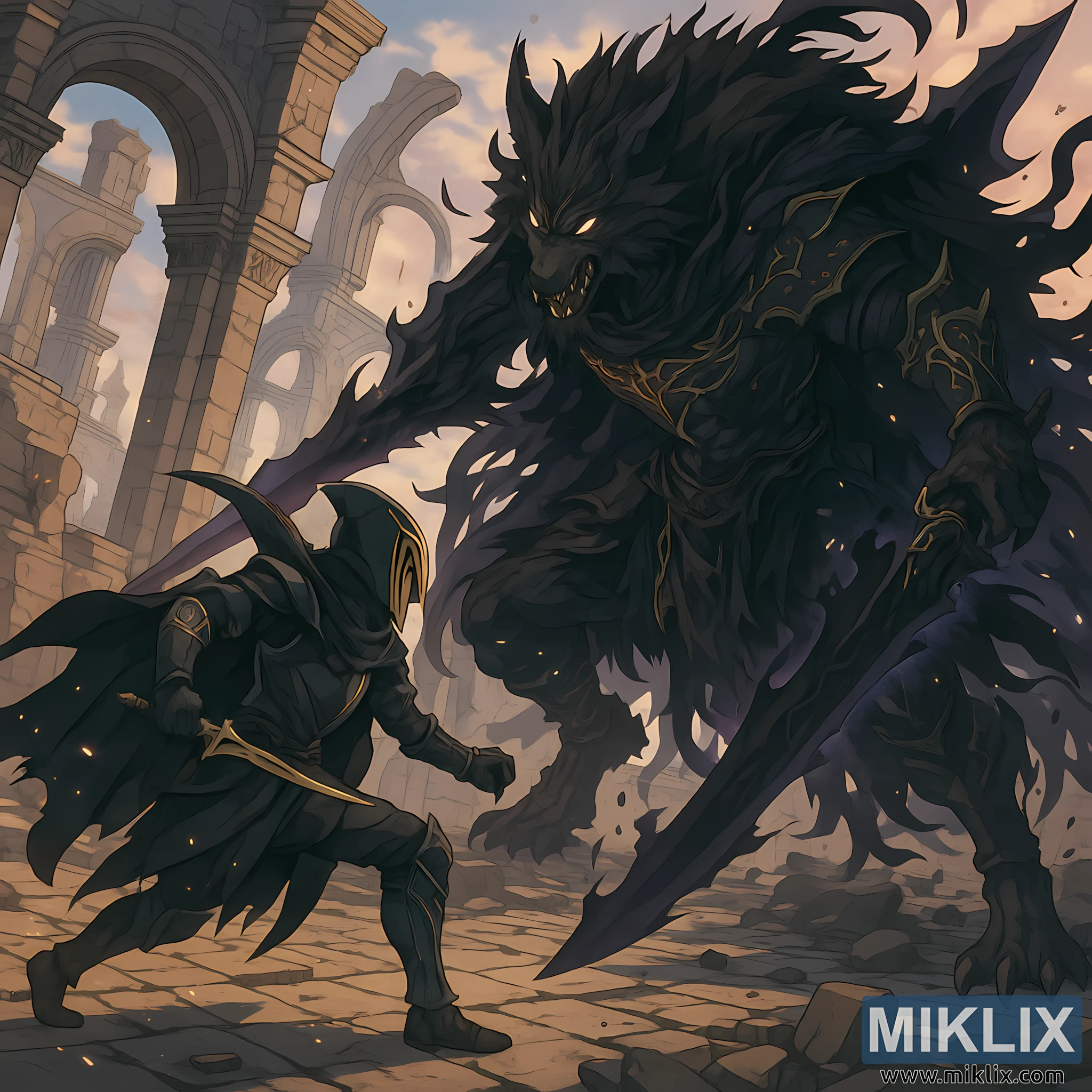 Maliketh se tyčí naproti němu ve víru kožešin, stínů a obsidiánových plátů. Jeho mohutná postava se vlní prudkou, nepřirozenou energií, jako by se jeho celé tělo napínalo proti fyzickému světu. Jeho oči planou divokou záři, upřené na jeho soupeře. Okraje jeho brnění a svalstva lemují roztřepené zlaté pruhy, slabě zářící jako roztavená ruda pod sopečným kamenem. Jeho obrovský meč – temný jako noc s jemným fialovým podtónem – se obloukovitě vine vzduchem a vyzařuje hmatatelný pocit ničivé síly. Z zbraně se odlupují závoje stínů, jako by pohlcovala světlo kolem sebe.