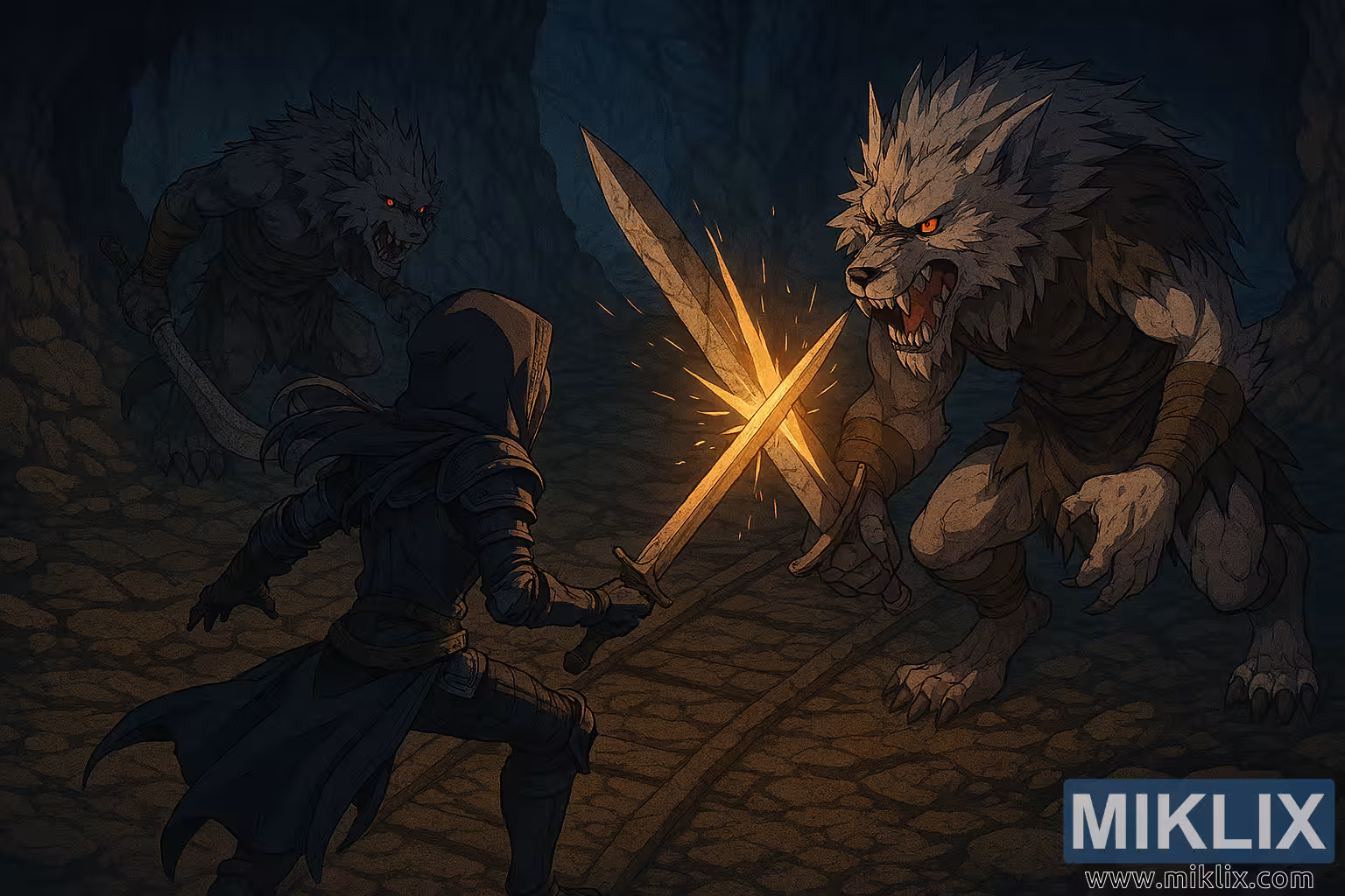 Uprostřed scény se zleva řítí druhý Beastman, částečně zakrytý skalnatým terénem. Tento tvor má tmavě šedou srst, zářící rudé oči a v pravé ruce zdvižený zakřivený meč podobný kameni. Jeho postoj naznačuje bezprostřední náraz a dodává kompozici napětí a pohyb.