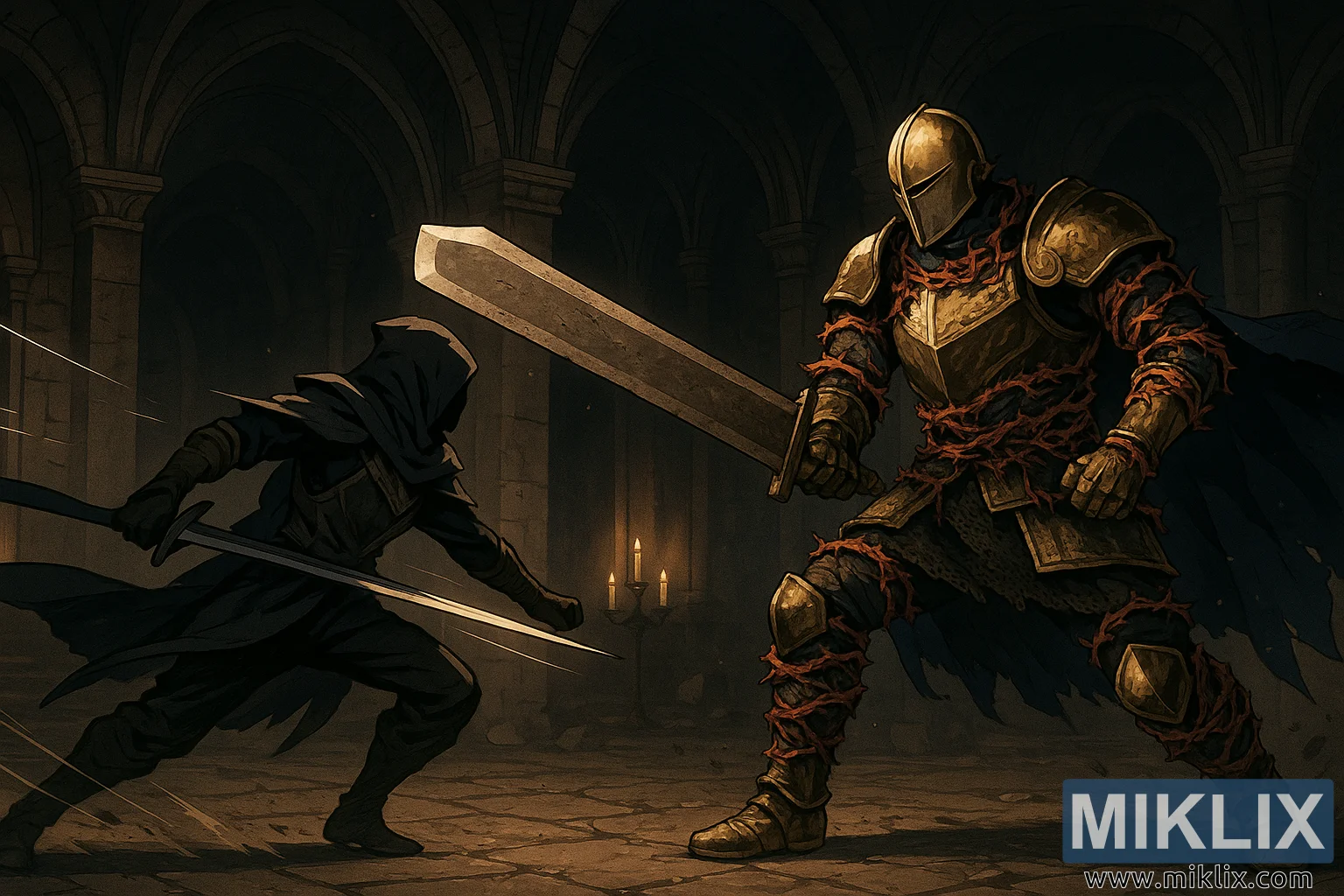 Obrázek zobrazuje napjatou, anime inspirovanou bitevní scénu, zasazenou do Stínitého hradu Elden Ring, zarámovanou do široké, filmové krajinné kompozice. Konfrontace se odehrává uvnitř rozlehlé, chátrající gotické haly, která připomíná zřícenou katedrálu. Nad hlavou se tyčí tyčící se kamenné sloupy do žebrovaných oblouků, jejichž povrchy jsou opotřebované a ztmavené věkem. Prostor je slabě osvětlen roztroušenými svíčkami umístěnými podél stěn a podlahy, jejichž teplé, mihotavé světlo prořezává těžké stíny a vrhá dlouhé siluety na popraskané kamenné dlaždice. Prach a jemné úlomky se nenápadně vznášejí ve vzduchu a naznačují sílu a pohyb probíhajícího střetu.