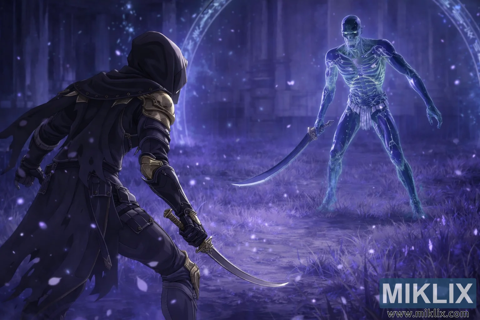 Osvětlení a barvy hrají ústřední roli v náladě obrazu. Scéně dominují chladné, zářivé modré a fialové odstíny, které vrhají jemné odlesky na okraje brnění a čepele zbraní, zatímco tváře a jemnější detaily zůstávají částečně zakryté. Ostrý kontrast mezi tmavým, stinným brněním Zakaleného a zářivou, přízračnou formou Pána Onyxů vizuálně podtrhuje střet mezi stínem a tajemnou mocí. Celkově snímek zachycuje tichý, dech se zadržující okamžik napětí, kdy oba válečníci postupují opatrně, plně si vědomi toho, že další krok roznítí násilnou a rozhodující bitvu.