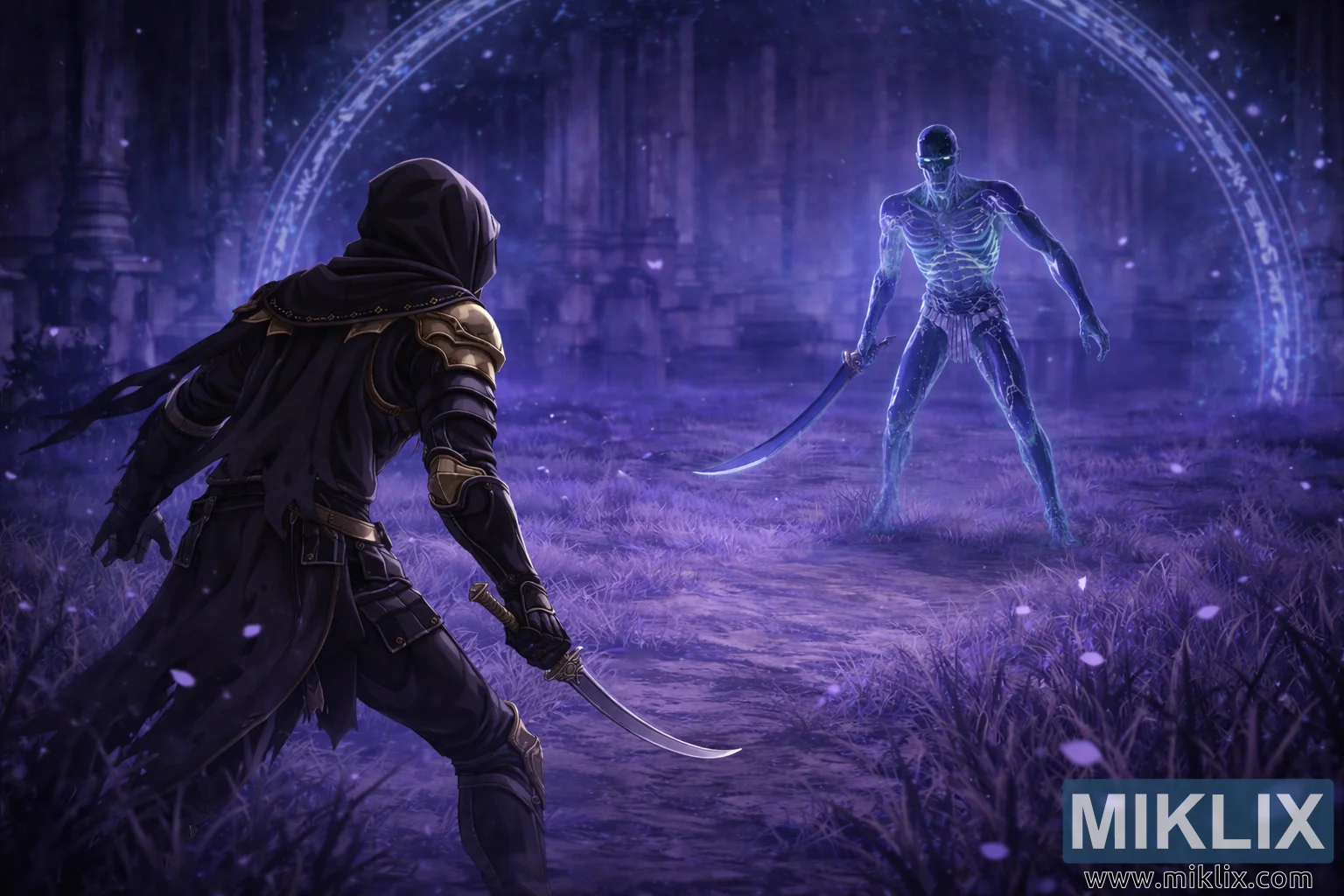 Osvětlení a barvy sjednocují kompozici. Paletě dominují chladné modré a fialové odstíny, které jemně odrážejí okraje brnění, zbraně a kontury obou postav, zatímco tváře a jemné detaily zůstávají částečně zakryté. Kontrast mezi tmavým, stinným brněním Poškvrněného a zářivou, přízračnou formou Pána Onyxů podtrhuje tematický střet mezi nenápadností a tajemnou mocí. Celkově širší záběr kamery umocňuje pocit rozsahu, napětí a nevyhnutelnosti a zachycuje dechberoucí okamžik, kdy oba válečníci opatrně postupují, plně si vědomi toho, že dalším krokem se rozpoutá prudký pohyb.