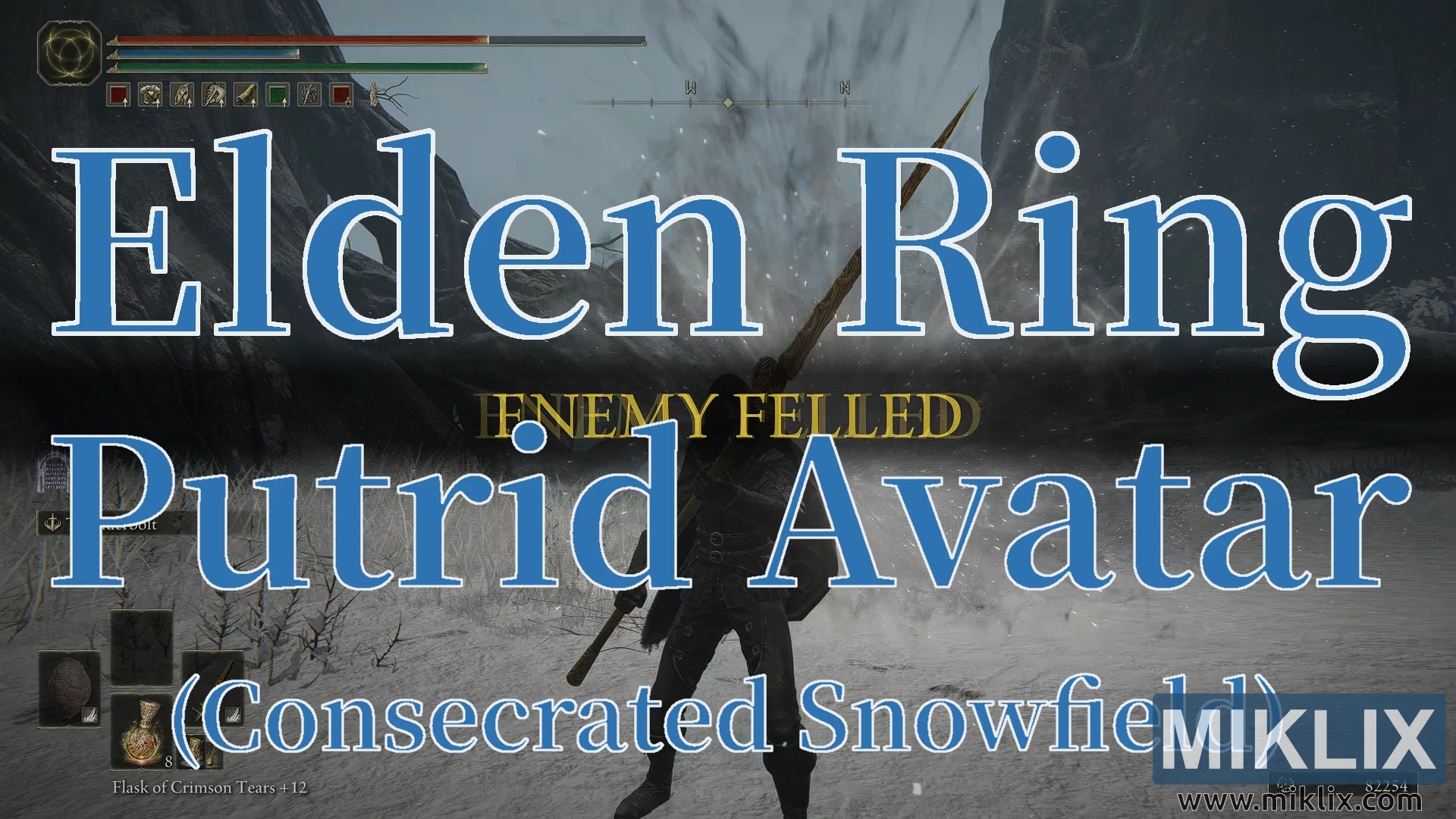 Obrázek překrývá tučný popisek: „Elden Ring – Putrid Avatar (Consecrated Snowfield)“, který označuje toto vítězství v závěru hry. Hráčská postava se zbraní v ruce vítězí nad zkaženým strážcem – vizuální důkaz dovedností, strategie a odolnosti.