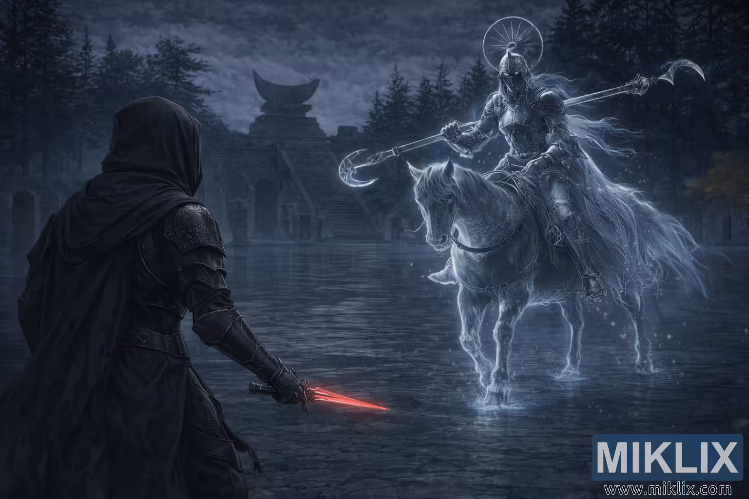 Obrázek: Černý nůž vs. Královská rytířka Loretta – Elden Ring Fan Art