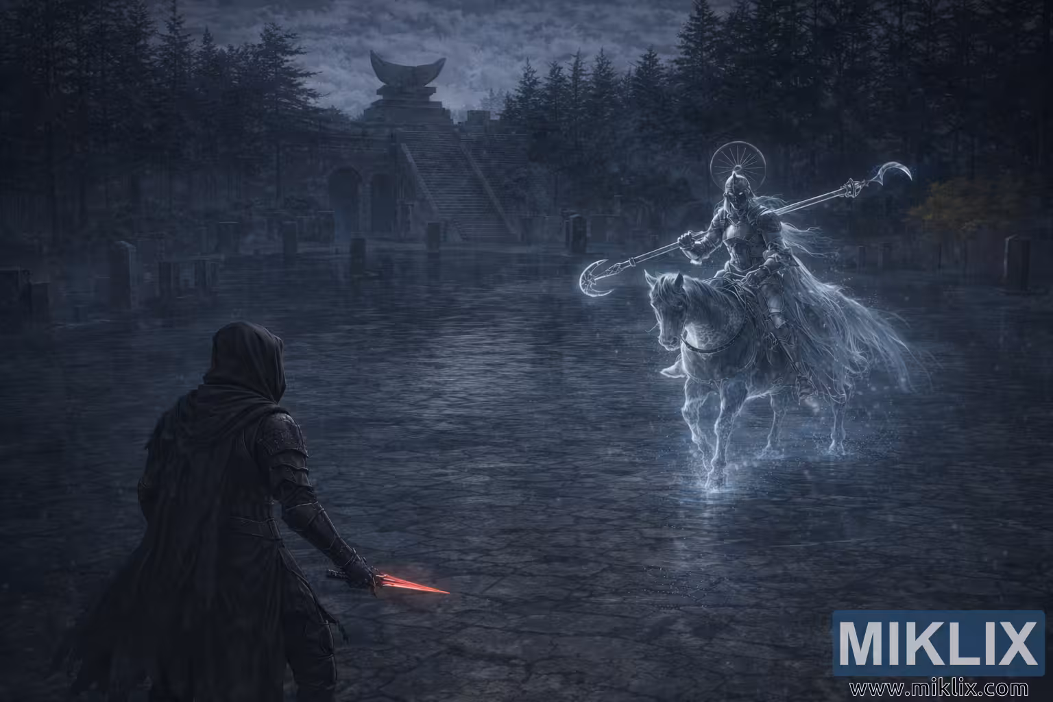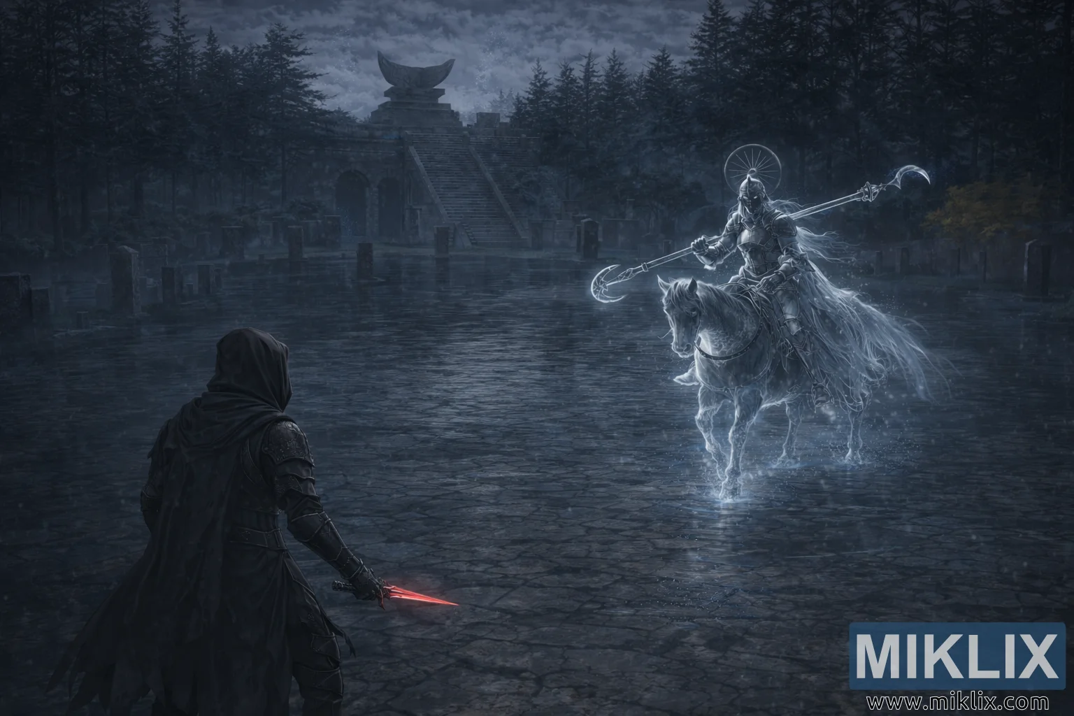 Na levé straně dlážděné mýtiny stojí osamělá postava oděná v ikonické zbroji Černého nože – elegantní, tmavé a hrozivé. Zahalená tvář vraha je zahalena stínem a jeho postoj je napjatý, připravený k boji. V ruce září karmínová dýka, pulzující zlověstnou energií, vizuální odkaz na spektrální čepel Černého nože, která kdysi srážela polobohy. Propracované detaily a matný povrch zbroje ostře kontrastují s éterickou září zbraně a zdůrazňují nenápadnou a smrtící schopnost postavy.