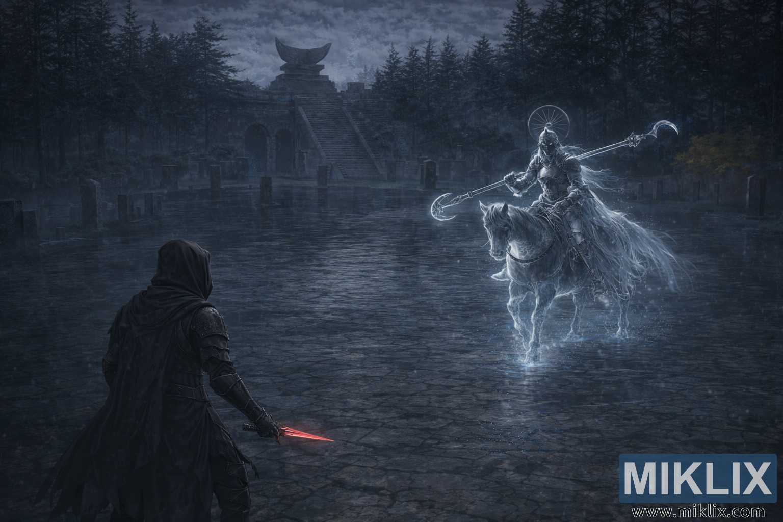 Tento obrázek vzdává hold jednomu z nejpamátnějších setkání ve hře Elden Ring a mísí v sobě narativní sílu s uměleckou finesou. Vodoznak „MIKLIX“ a webové stránky „www.miklix.com“ v pravém dolním rohu identifikují tvůrce, jehož smysl pro detail a zvládnutí nálady vdechují tomuto fanouškovskému umění život. Ať už je vnímán jako pocta hernímu příběhu, nebo jako samostatné fantasy dílo, obrázek evokuje strašidelnou krásu a napínavé drama, které definují Lands Between.