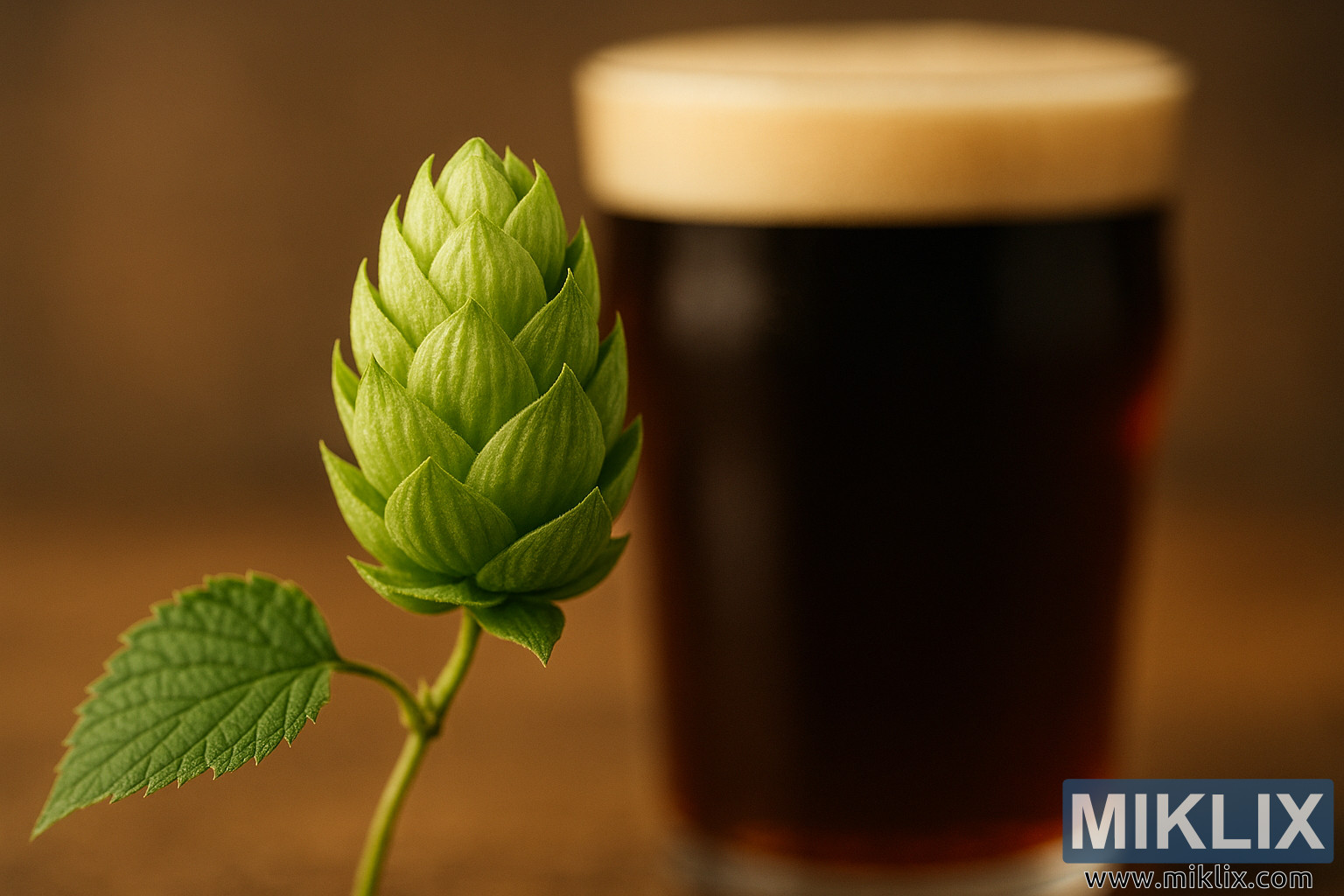 Jemně rozmazaném pozadí stojí půllitr tradičního porteru, jehož tmavě mahagonová barva hřejivě září ve stejném zlatém světle. Kontrast mezi zářivě zelenou chmele a bohatou tmavě hnědou barvou porteru vytváří vizuální harmonii, která odráží jejich doplňkový vztah při vaření. Krémová pěnová čepička piva tvoří hladký, světlý okraj v horní části sklenice, jehož textura je příjemná a sametová. Průsvitnost porteru poblíž dna sklenice odhaluje jemné jantarové podtóny, které naznačují hloubku a komplexnost – charakteristické znaky dobře připraveného tmavého piva. Záměrné rozmazání pozadí (bokeh) umocňuje soustředění diváka na chmelový šištici a zároveň umožňuje pivu poskytnout kontext a hloubku příběhu.