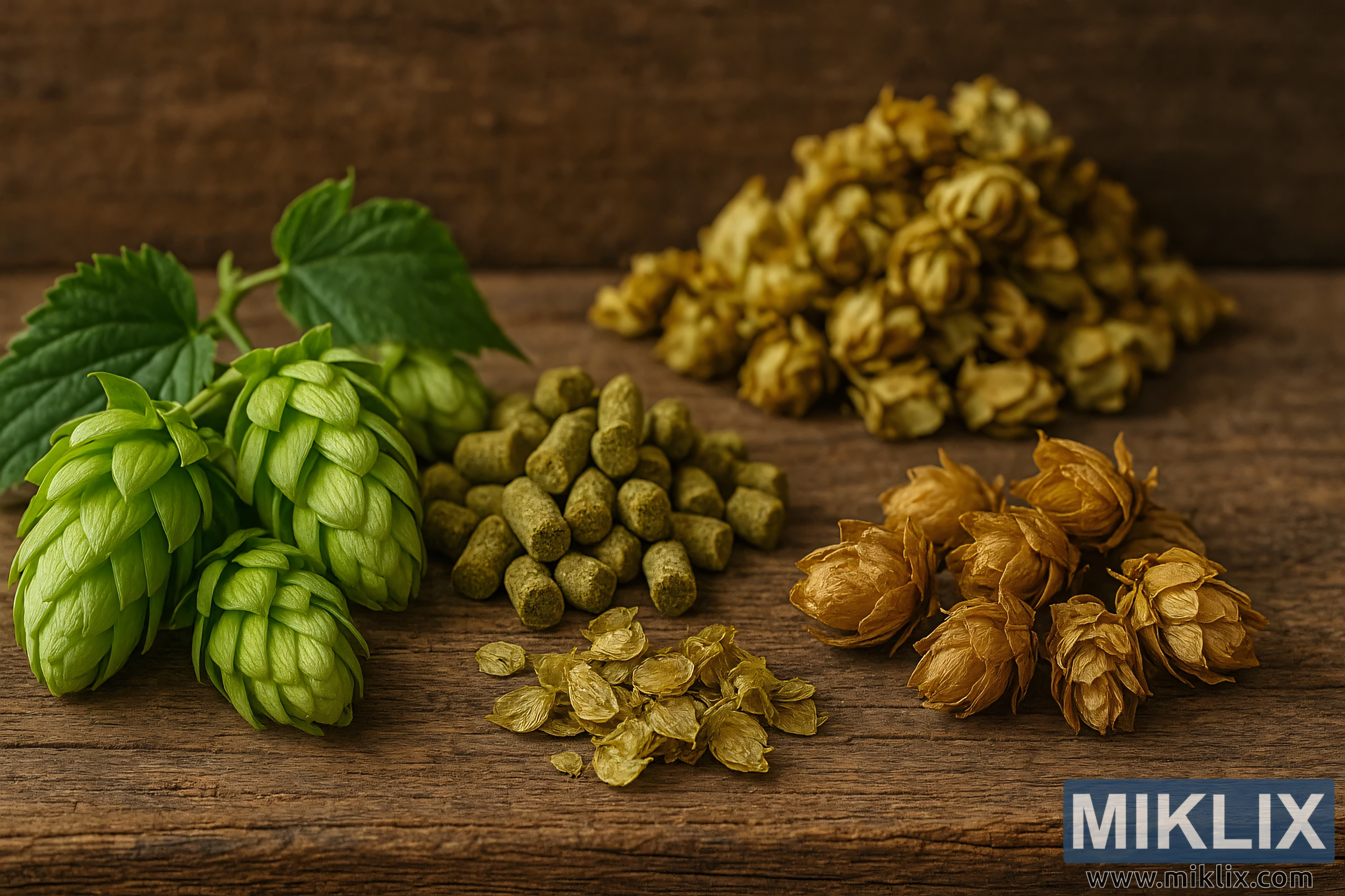 Celkově kompozice vyjadřuje více než jen fyzickou rozmanitost chmele; naznačuje dialog sládka s přírodou a procesem. Každá forma chmele má ve vaření piva své místo: čerstvé šišky plné těkavých olejů, ideální pro pozdní přidání, pelety nabízející koncentrovanou hořkost a účinnost, a zralé šišky, které dodávají charakter tradičním stylům. Obraz se stává tichou oslavou těchto voleb, připomínkou toho, že každý půllitr piva v sobě nese odkaz takového pečlivého výběru. Zátiší, ačkoli statické, pulzuje implicitním pohybem – pohybem z pole do pece, z kornoutu do pelet, ze surové rostliny k řemeslnému pivu – ztělesňující spojení zemědělství, vědy a umění, které definuje vaření piva.