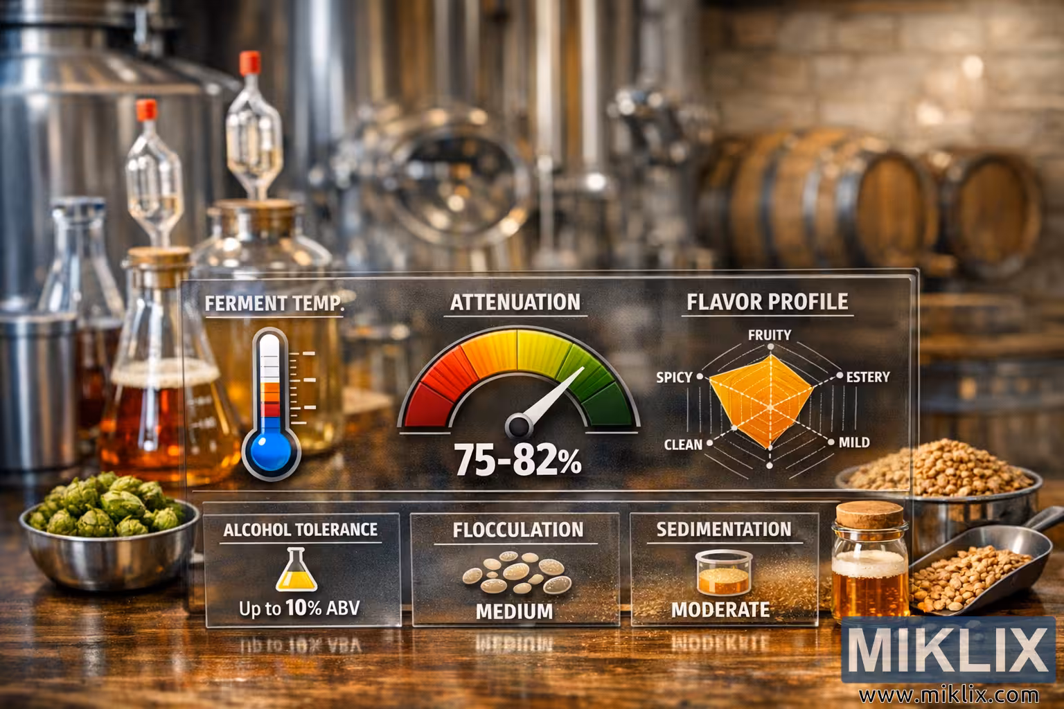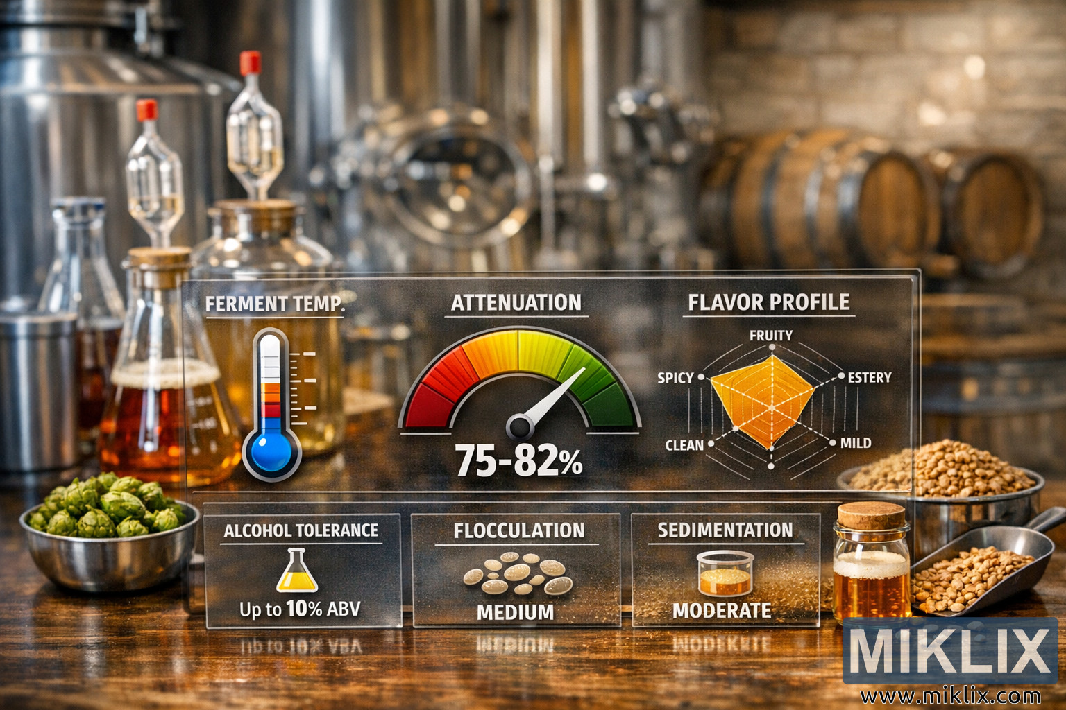 Obrázek představuje vysoce detailní, profesionální vizuální kompozici, která má informativní a vizuálně poutavým způsobem sdělit specifikace kmene pivovarských kvasnic. V popředí průhledný panel podobný sklu zobrazuje důležité statistiky kvasinek prostřednictvím čisté, moderní infografiky vykreslené v zářivých, ale kontrolovaných barvách. Jasné popisky a ikony zvýrazňují klíčové parametry vaření piva, jako je teplota fermentace, rozsah prokypování, tolerance alkoholu, flokulace, sedimentace a chuťový profil. Ukazatel prokypování je umístěn centrálně a zobrazuje se jako barevně odstupňovaný ciferník od teplé červené po svěží zelenou, což okamžitě upoutá pozornost diváka. Poblíž stylizovaný teploměr zobrazuje teplotu fermentace, zatímco menší panely níže shrnují toleranci alkoholu, flokulaci a sedimentaci pomocí jednoduchých, intuitivních symbolů. Vpravo radarový graf chuťového profilu vizuálně vyvažuje atributy, jako je ovocná, esterová, kořeněná, jemná a čistá chuť, a poskytuje tak okamžitý přehled o senzorickém dopadu kvasinek.