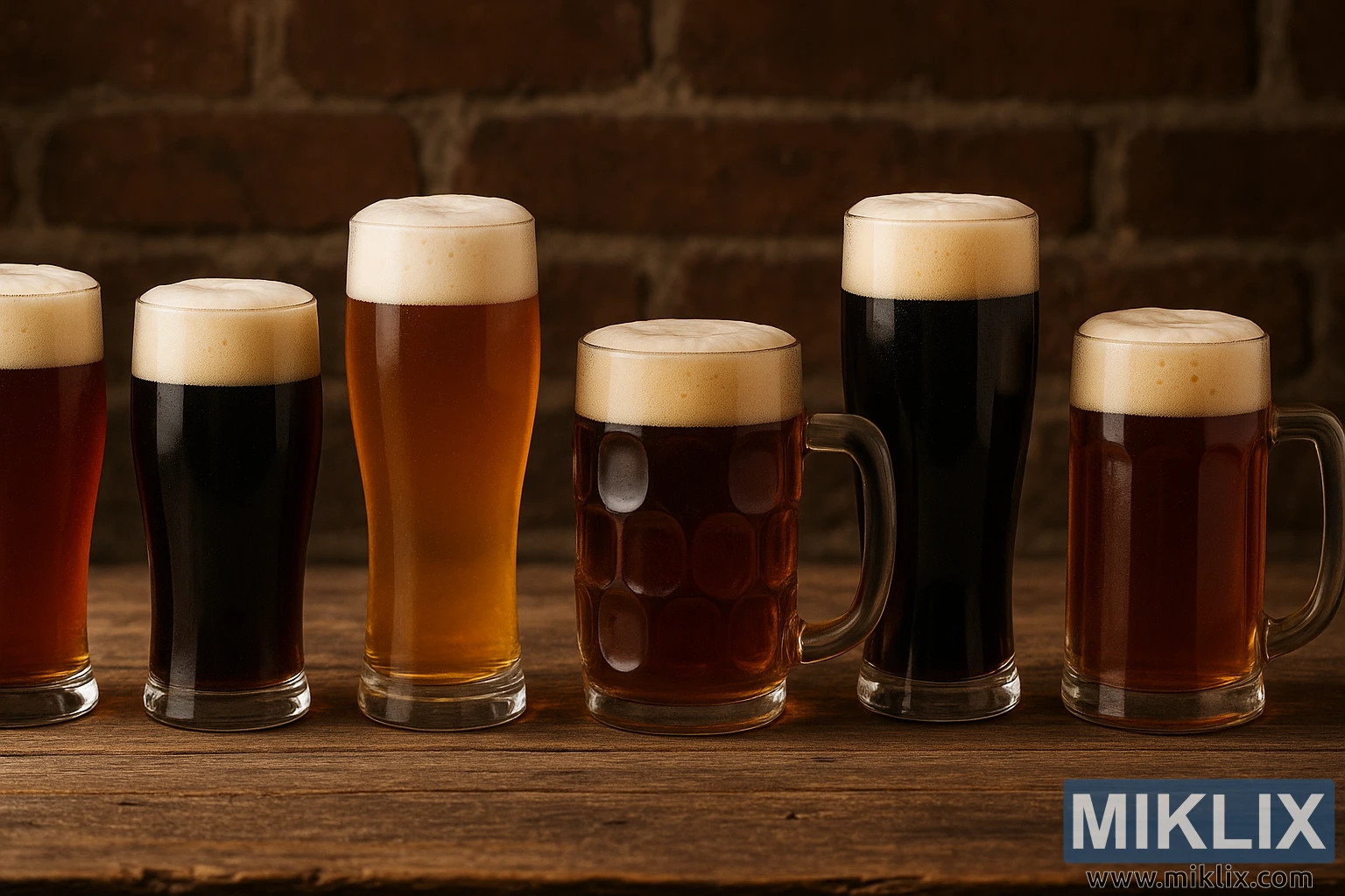 Zleva doprava piva představují spektrum stylů a odstínů, které ztělesňují bohatství německých pivovarnických tradic. První sklenice obsahuje tmavě červenohnědé pivo s krémovou, téměř bílou pěnou, která naznačuje bohatost sladu a karamelové podtóny. Vedle ní upoutá pozornost tmavší sklenice téměř černého piva svou neprůhlednou hloubkou a hnědou pěnou, která evokuje chuť praženého sladu, čokoládové tóny a možná i hřejivou sílu. Třetí sklenice nabízí zlato-jantarové pivo, zářící jasem, když skrz něj prosvítá světlo, zakončené silnou bílou pěnou, která vypovídá o svěžesti a živém perlení. Čtvrté pivo, nalité do hrnku s důlky, je kaštanově zbarvený nápoj s pěnivou korunkou, jehož odstín připomíná pražený slad, chuť chleba a hladkou pitelnost.