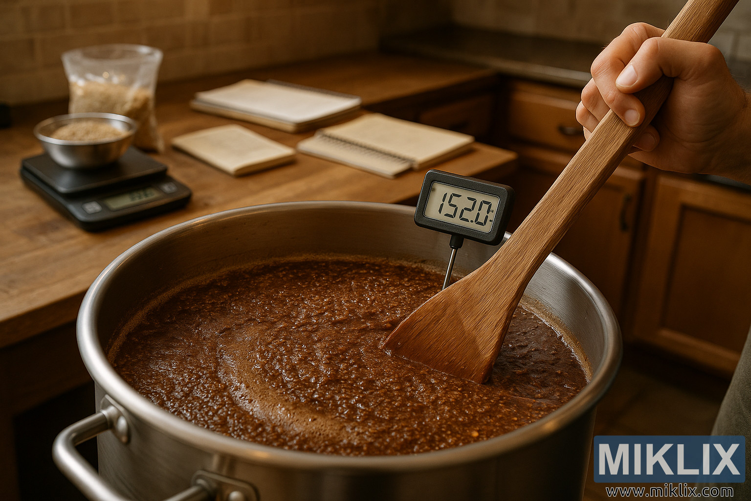 srdci teple osvětlené domácí kuchyně snímek zachycuje okamžik soustředěného řemeslného zpracování a smyslového ponoření do procesu vaření piva. Pracovní deska ožívá smyslem, proměněna z domácího pracovního prostoru v miniaturní varnu, kde se tradice setkává s precizností. Uprostřed scény se v měkkém světle třpytí velká nerezová káď na rmut, jejíž povrch je mírně zamlžený vnitřním horkem. Uvnitř jemně vaří bohatý, tmavý rmut vyrobený z čokoládového sladu, jehož povrch se vlní, když robustní dřevěná lopatka pečlivě míchá směs. Lopatka, opotřebovaná do hladka opakovaným používáním, se pohybuje hustou tekutinou s rytmem, který naznačuje jak zážitek, tak úctu – nejedná se o ledabylé míchání, ale o hmatové spojení se srdcem nápoje.