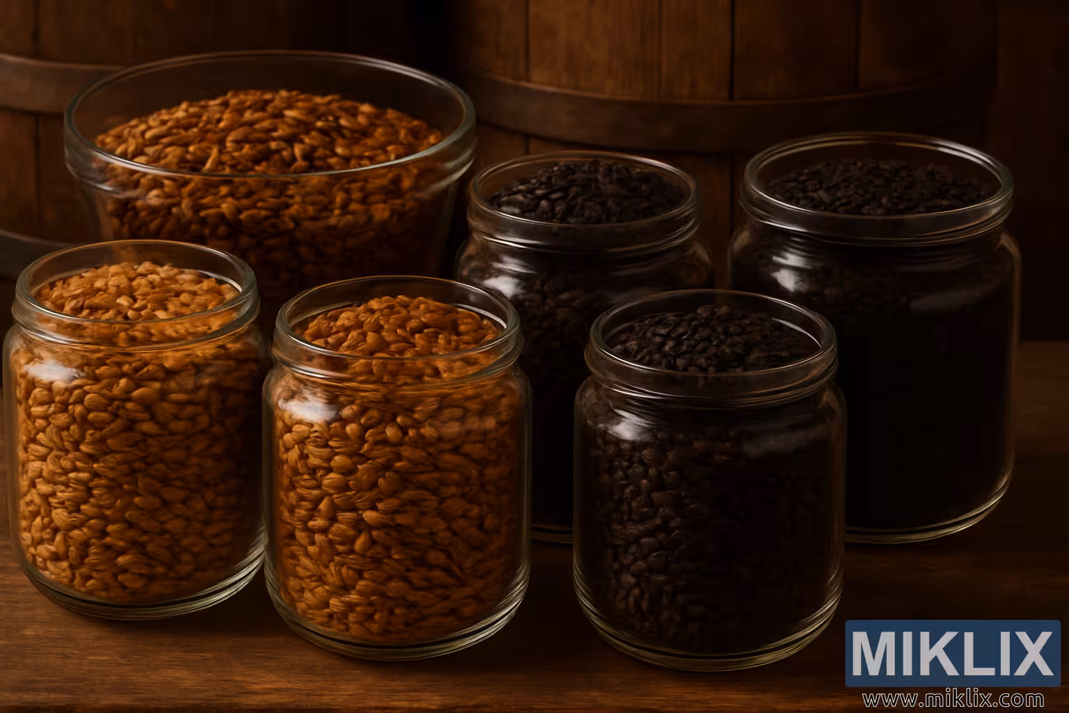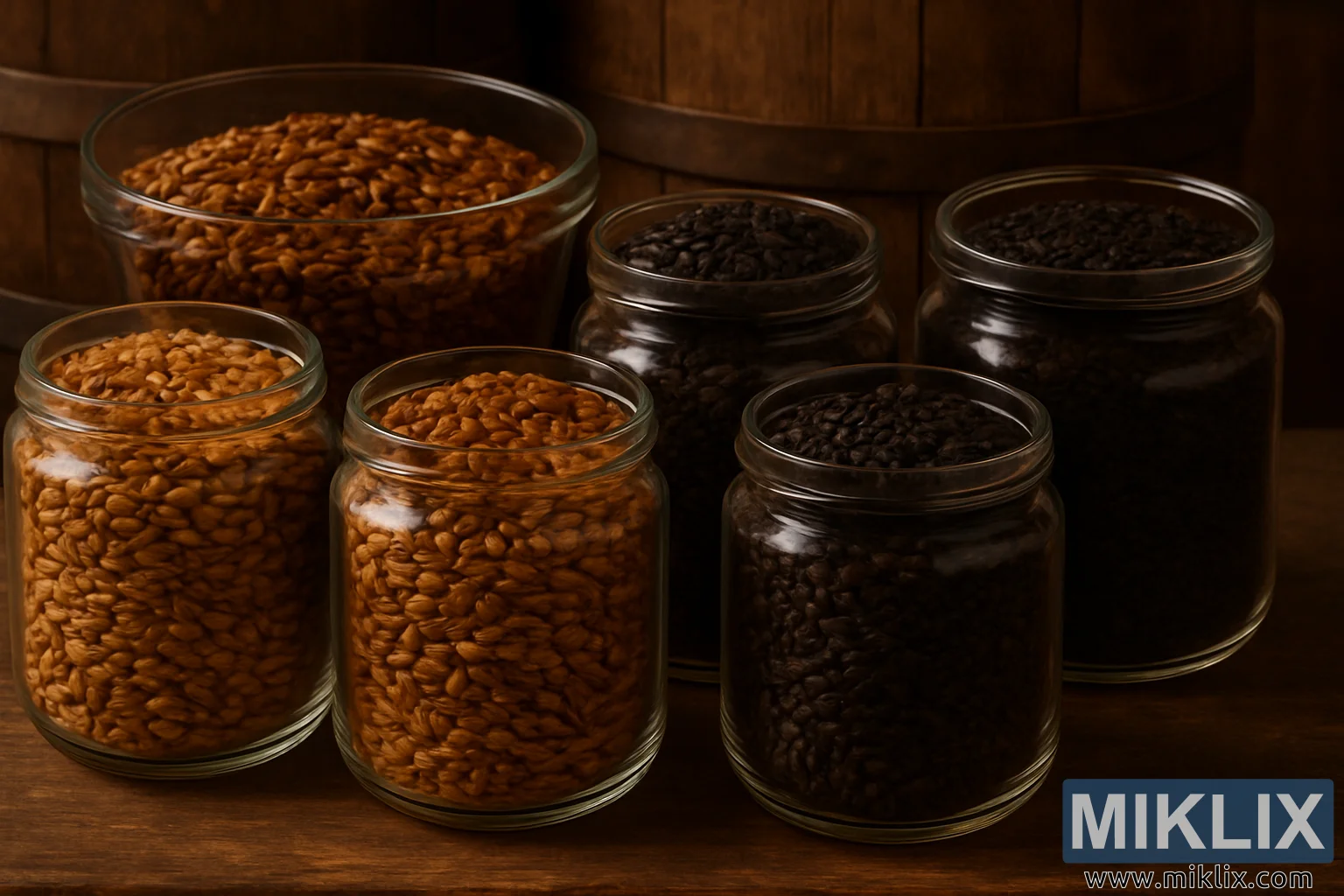 Úhledně uspořádané sklenice hnědého sladu od jantarových po čokoládové odstíny, postavené na dřevěných bednách, zdůrazňují jejich roli při vaření komplexních, chutných piv.