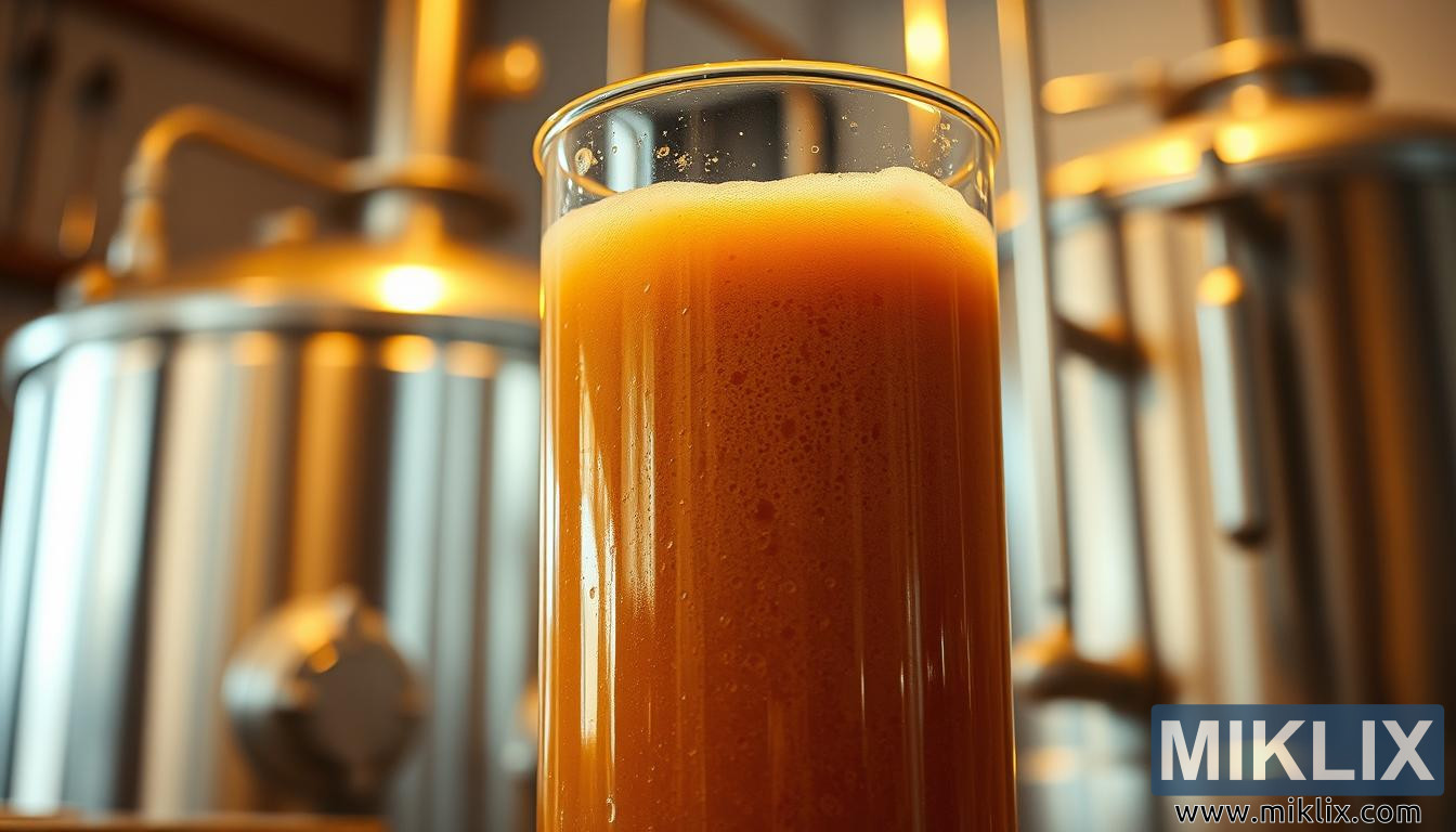tomto evokativním detailním záběru zachycuje snímek okamžik proměny v srdci procesu vaření piva – skleněnou kádinku naplněnou pěnivou, bublající hnědou tekutinou, jejíž povrch ožívá pohybem a příslibem. Tekutina, bohatá na barvu a texturu, září pod teplým, zlatým osvětlením, které zdůrazňuje její karamelizovaný odstín a zdůrazňuje jemné přechody jantarové a kaštanové barvy vířící uvnitř. Pěna na povrchu tekutiny je hustá a krémová, drží se okraje kádinky v jemných vrcholcích, což je vizuální důkaz probíhající aktivní fermentace. Drobné bublinky stabilně stoupají z hlubin a lámou hladinu v rytmickém tanci, který naznačuje vitalitu i preciznost.