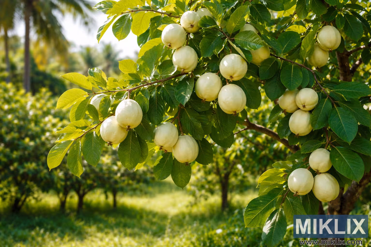 Tropical White Guava Tree in Sunlit Orchard