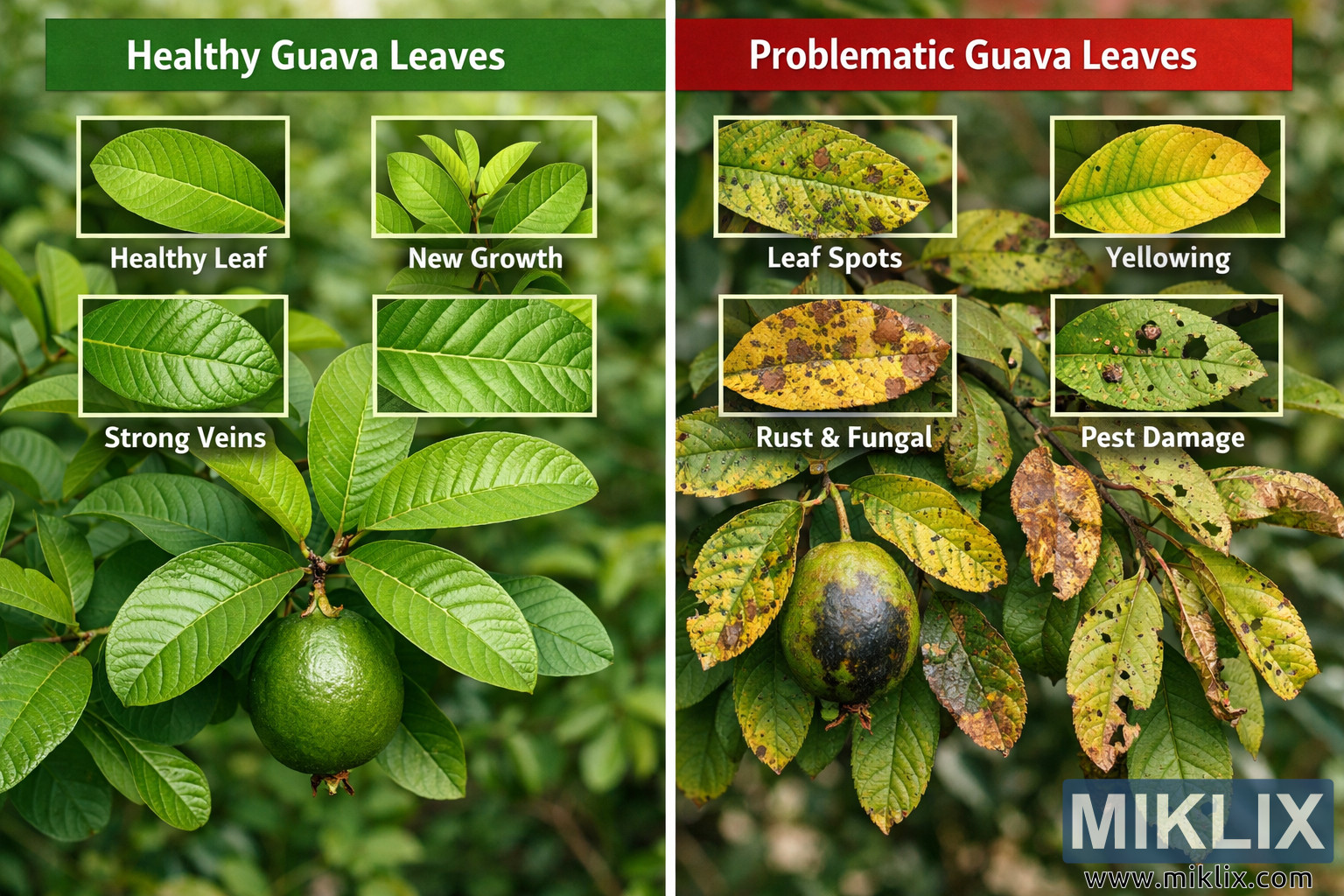 Obrázek je krajinářská srovnávací fotografie s vysokým rozlišením, která vizuálně kontrastuje zdravé listy guavy s problematickými listy guavy postiženými běžnými problémy se zdravím rostlin. Kompozice je vertikálně rozdělena na dvě stejné části jasnou bílou dělicí čarou, takže srovnání je okamžité a snadno srozumitelné. Na levé straně, označené jako „Zdravé listy guavy“, se listy jeví svěží, zářivě a jednotně zelené. Listy jsou široké a oválné s hladkými okraji a mírně lesklým povrchem. Jejich žilnatina je jasně definovaná a symetrická, což naznačuje silné cévní zdraví. Několik vložených záběrů zdůrazňuje specifické pozitivní vlastnosti, včetně jediného zdravého listu s rovnoměrným zbarvením, shluku něžných nových výhonků vycházejících ze stonku a detailních záběrů zdůrazňujících silné, dobře strukturované žilnatiny. Mezi listy prominentně visí zdravý zelený plod guavy, který posiluje představu prosperující rostliny s vyváženým růstem a dobrou celkovou vitalitou. Pozadí na této straně je jemně rozmazané, přičemž se pozornost soustředí na zdravé listy.